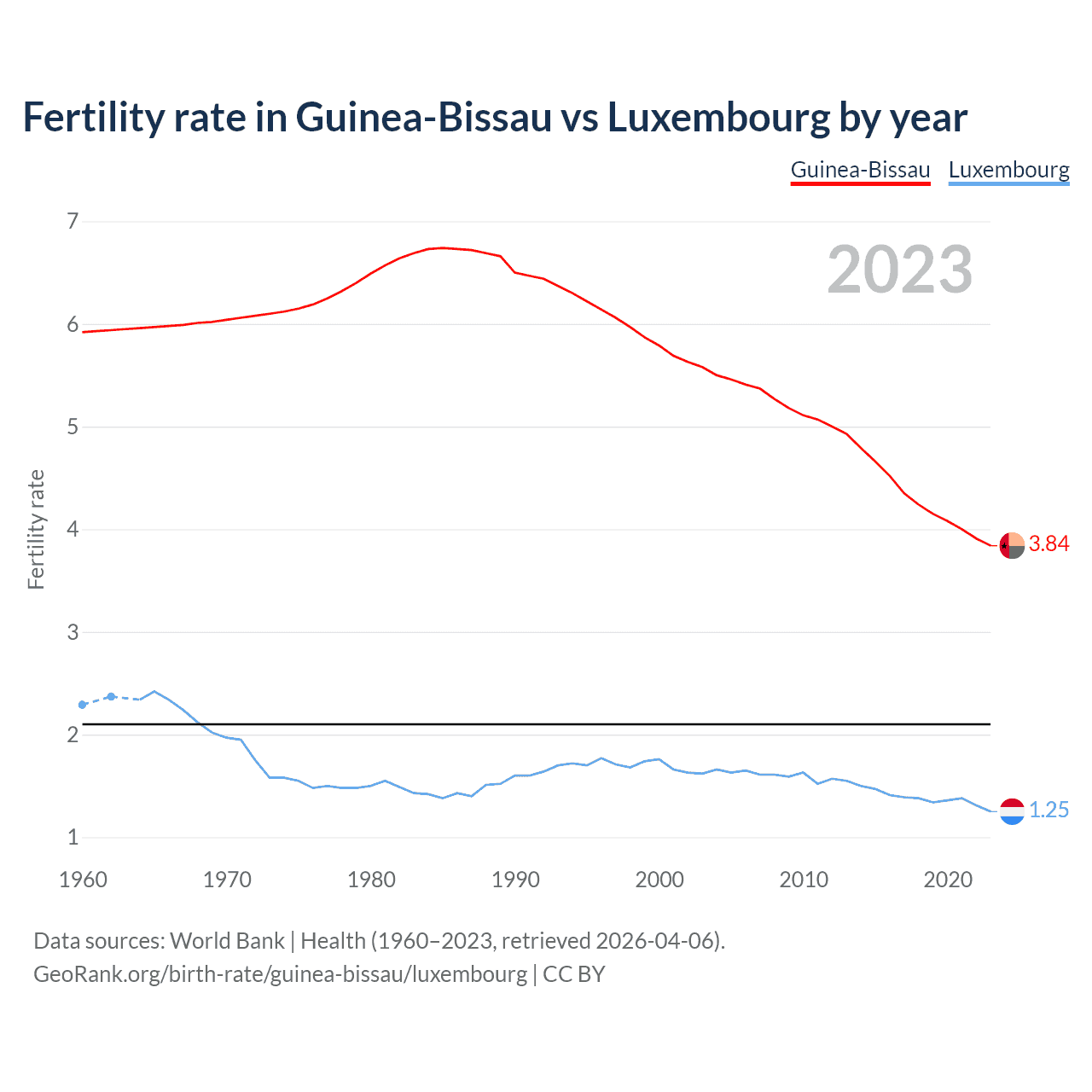According to the latest available data on birth rates, the fertility rate in Guinea-Bissau was 3.84 children per woman in 2023, compared to 1.25 in Luxembourg in 2023. The replacement level is considered to be 2.1 children per woman.