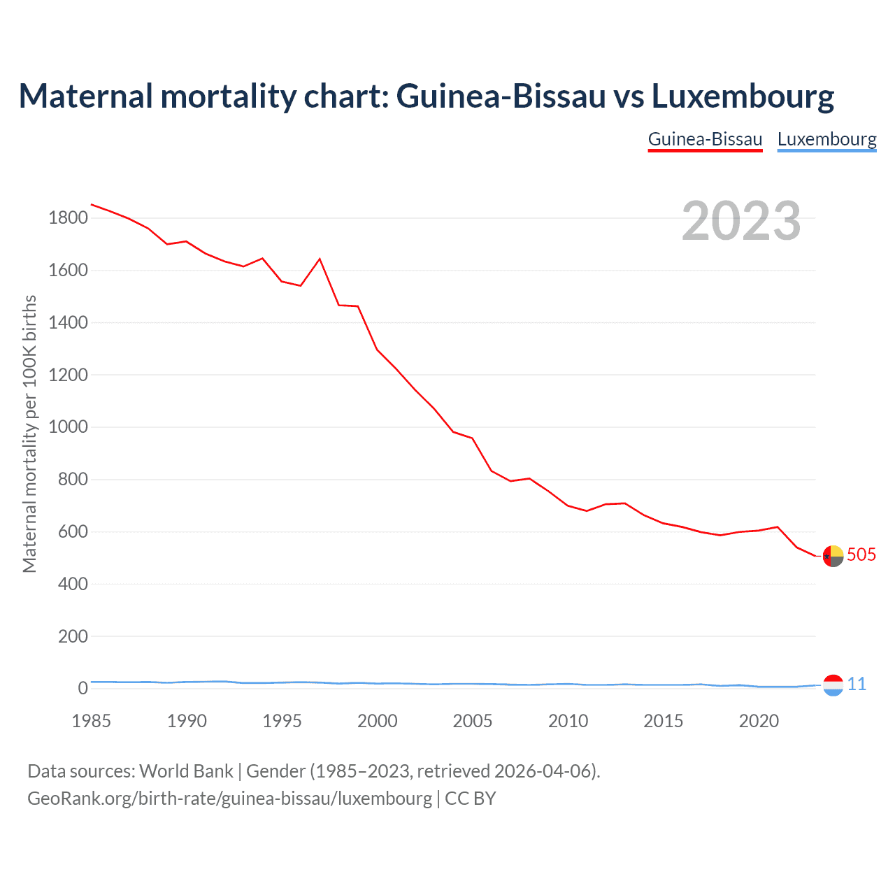 The maternal mortality rate, which is the probability of dying during childbirth or within 42 days of pregnancy termination, is 505 deaths per 100,000 live births in Guinea-Bissau, compared to 11 deaths in Luxembourg.