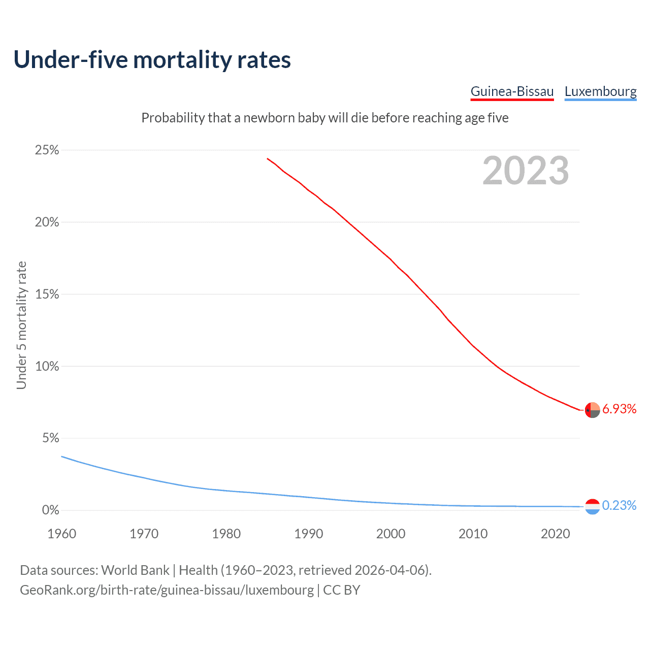 The chance that a newborn baby will die before reaching age five is 6.93% in Guinea-Bissau and 0.23% in Luxembourg. Above is a chart with historical data on under-five mortality rates.