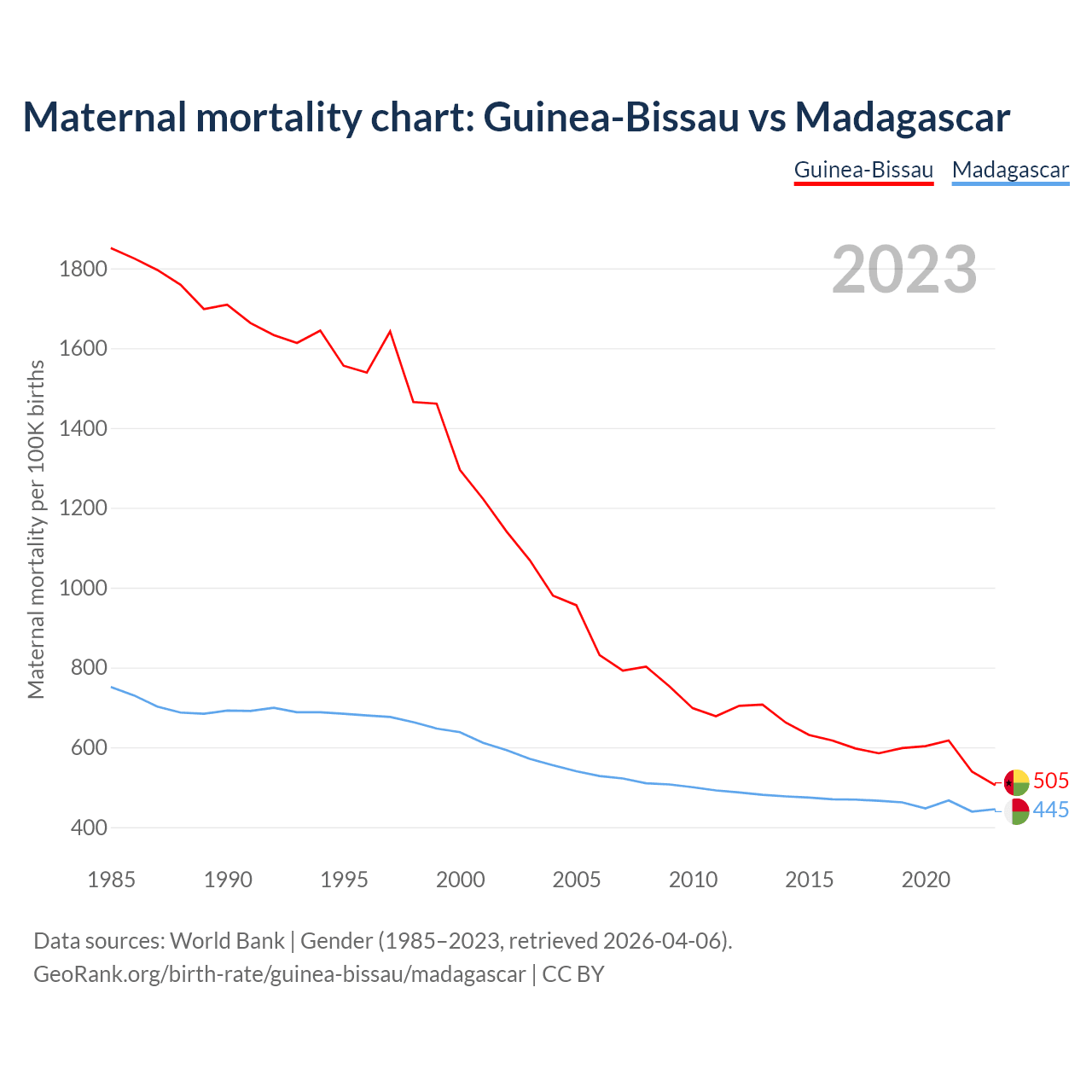 The maternal mortality rate, which is the probability of dying during childbirth or within 42 days of pregnancy termination, is 505 deaths per 100,000 live births in Guinea-Bissau, compared to 445 deaths in Madagascar.