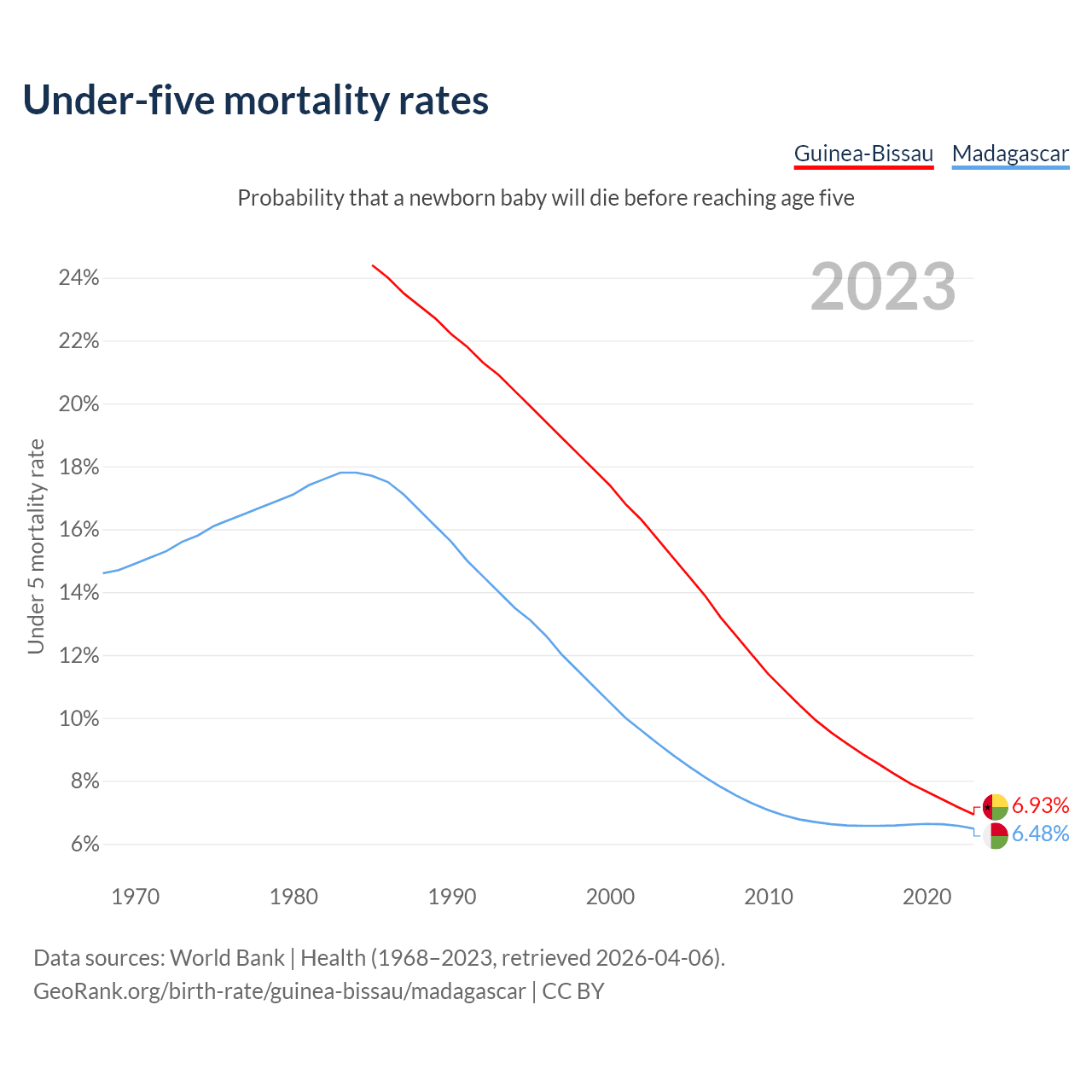 The chance that a newborn baby will die before reaching age five is 6.93% in Guinea-Bissau and 6.48% in Madagascar. Above is a chart with historical data on under-five mortality rates.