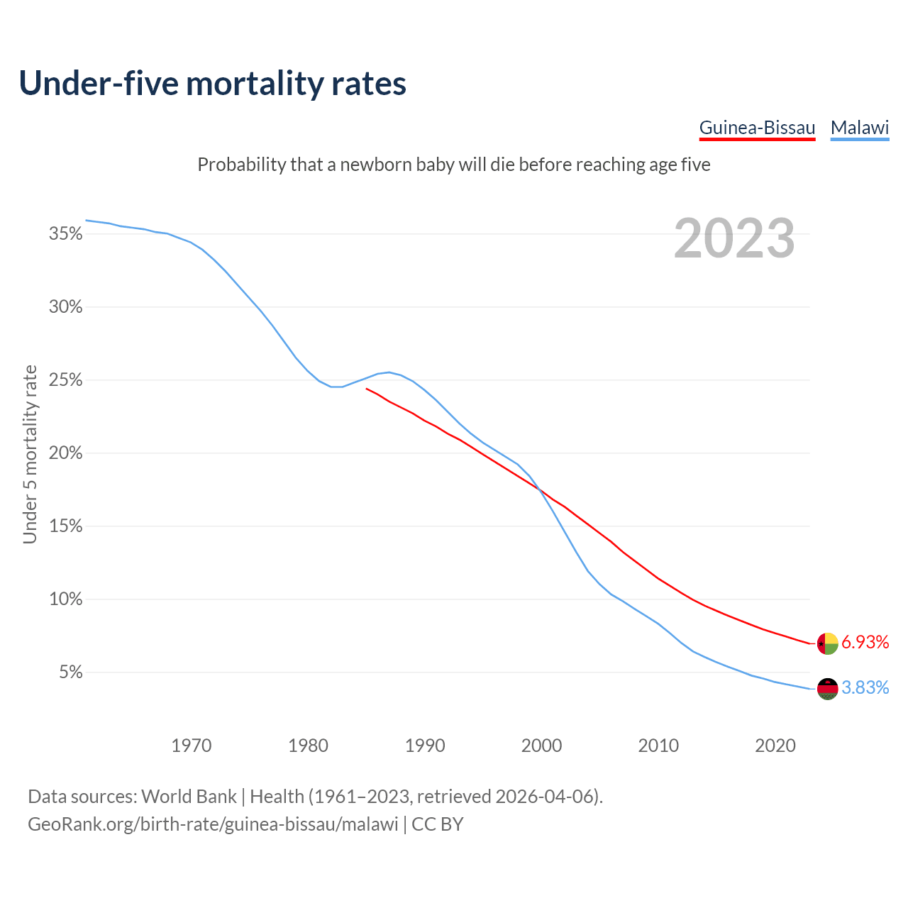The chance that a newborn baby will die before reaching age five is 6.93% in Guinea-Bissau and 3.83% in Malawi. Above is a chart with historical data on under-five mortality rates.