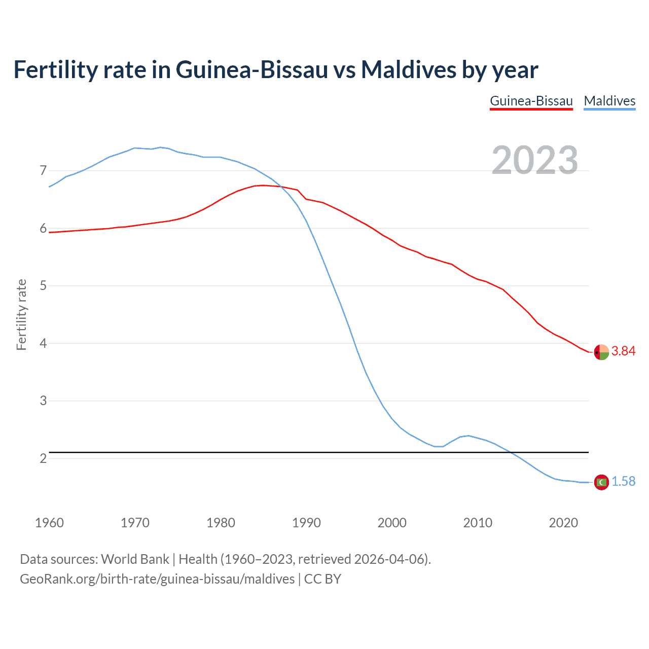 According to the latest available data on birth rates, the fertility rate in Guinea-Bissau was 3.84 children per woman in 2023, compared to 1.58 in Maldives in 2023. The replacement level is considered to be 2.1 children per woman.