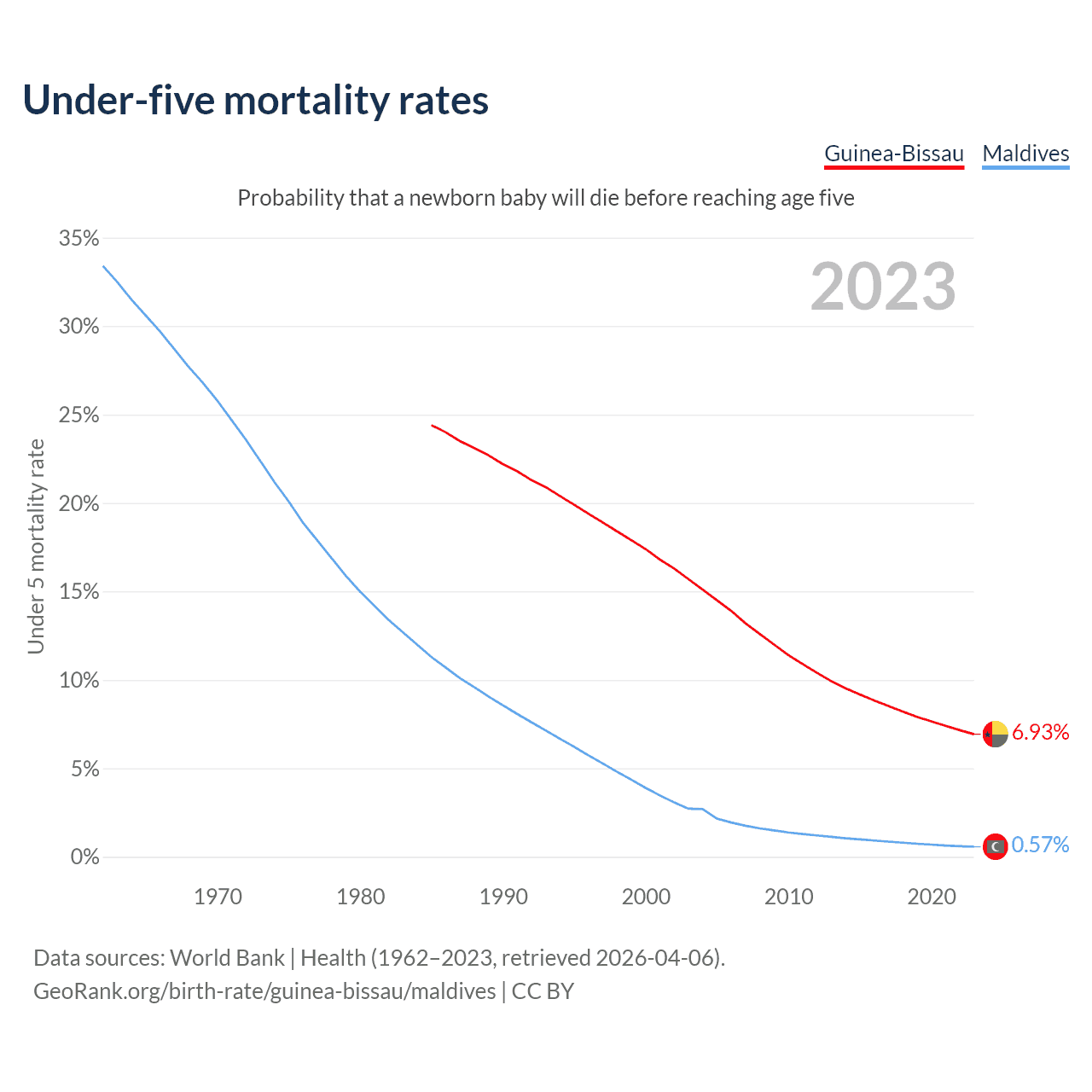 The chance that a newborn baby will die before reaching age five is 6.93% in Guinea-Bissau and 0.57% in Maldives. Above is a chart with historical data on under-five mortality rates.