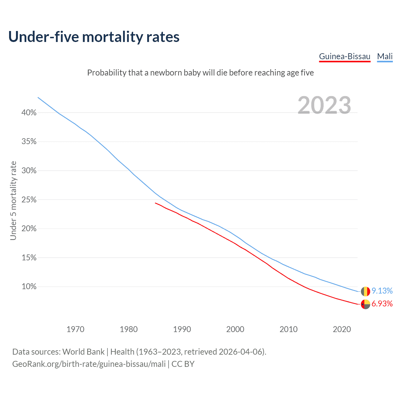 The chance that a newborn baby will die before reaching age five is 6.93% in Guinea-Bissau and 9.13% in Mali. Above is a chart with historical data on under-five mortality rates.
