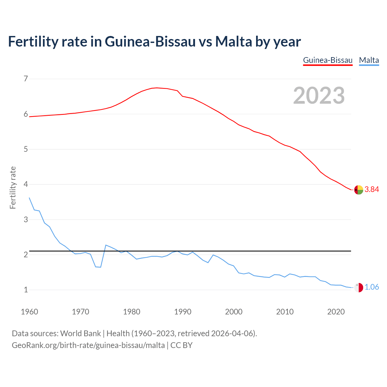 According to the latest available data on birth rates, the fertility rate in Guinea-Bissau was 3.84 children per woman in 2023, compared to 1.06 in Malta in 2023. The replacement level is considered to be 2.1 children per woman.