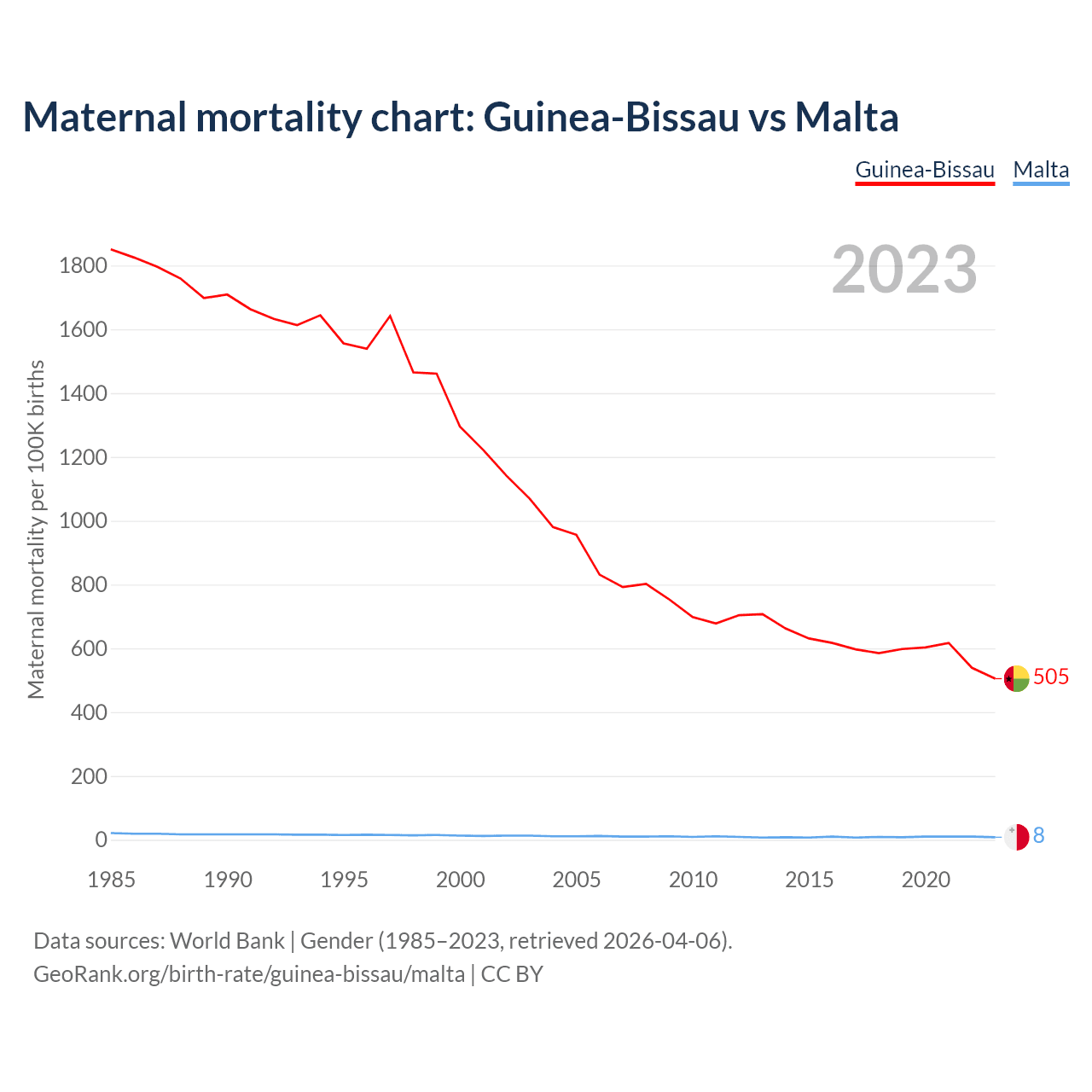 The maternal mortality rate, which is the probability of dying during childbirth or within 42 days of pregnancy termination, is 505 deaths per 100,000 live births in Guinea-Bissau, compared to 8 deaths in Malta.