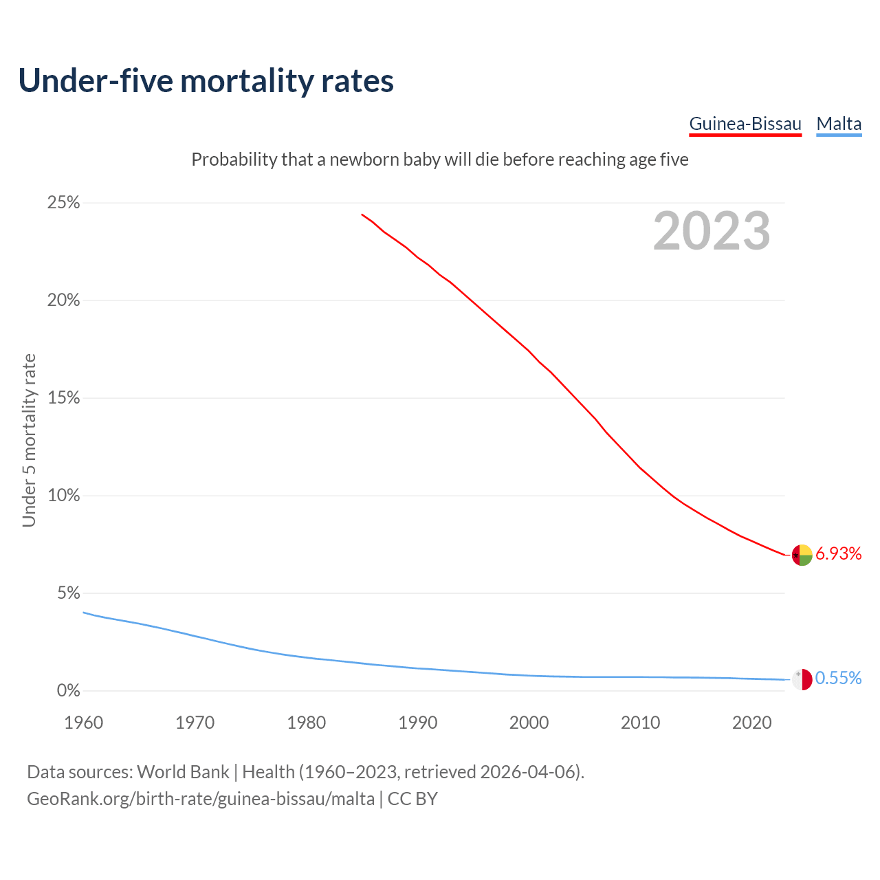 The chance that a newborn baby will die before reaching age five is 6.93% in Guinea-Bissau and 0.55% in Malta. Above is a chart with historical data on under-five mortality rates.