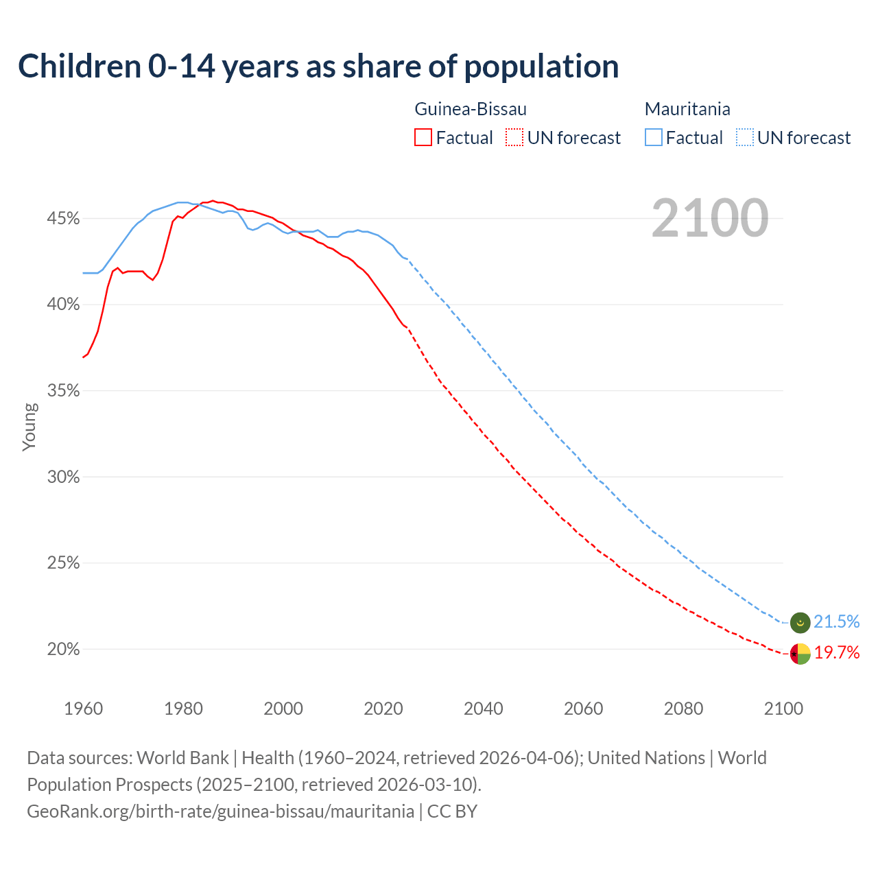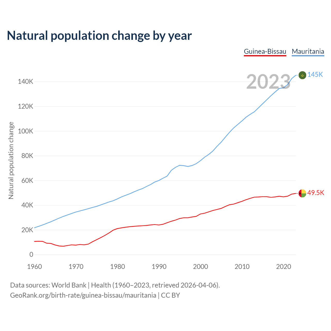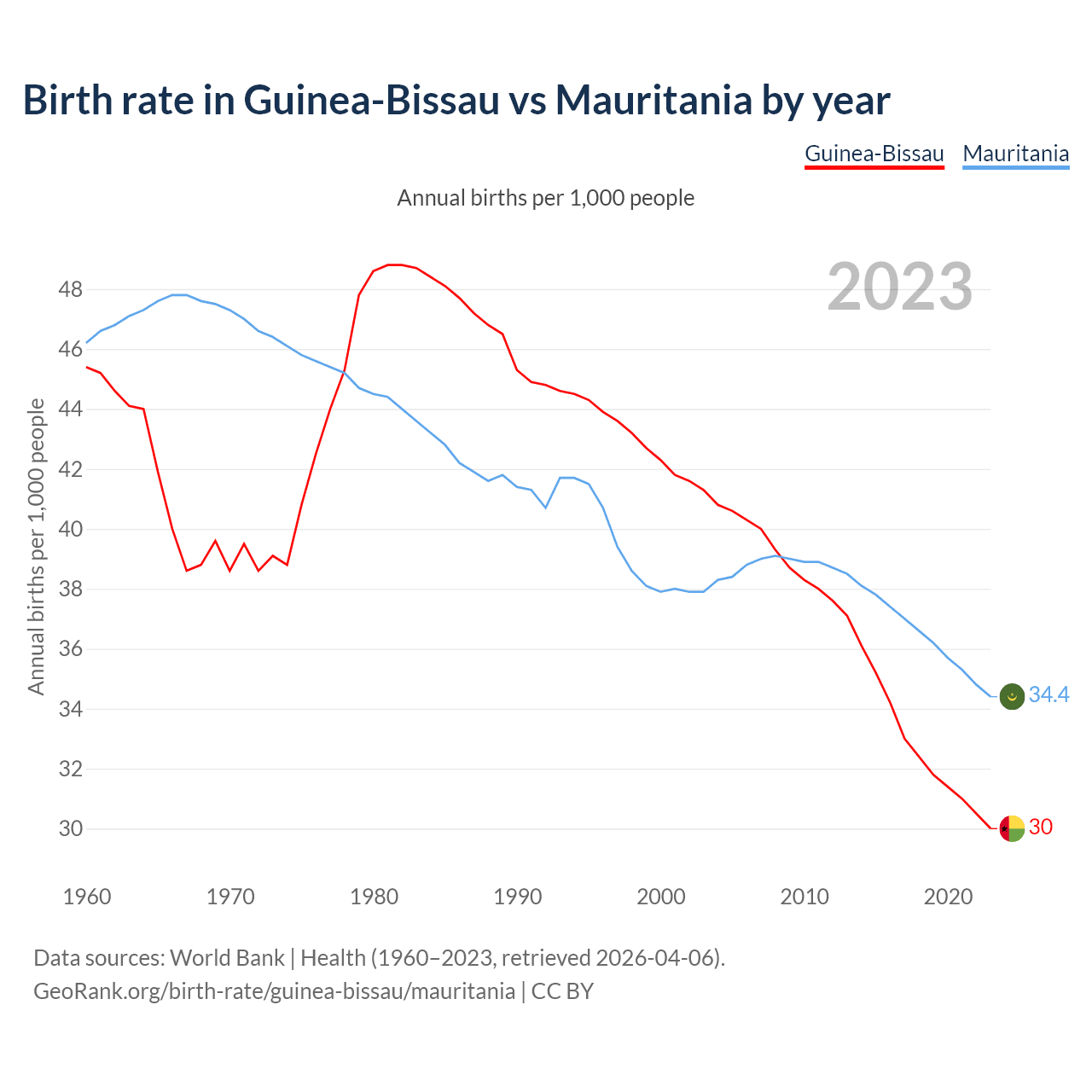 Guinea-Bissau has an annual birth rate of 30 births per 1,000 people, compared to 34.4 for Mauritania. The average number of children a woman is expected to have during her lifetime — the fertility rate, is 3.84 in Guinea-Bissau and 4.7 in Mauritania — 22.4% difference.