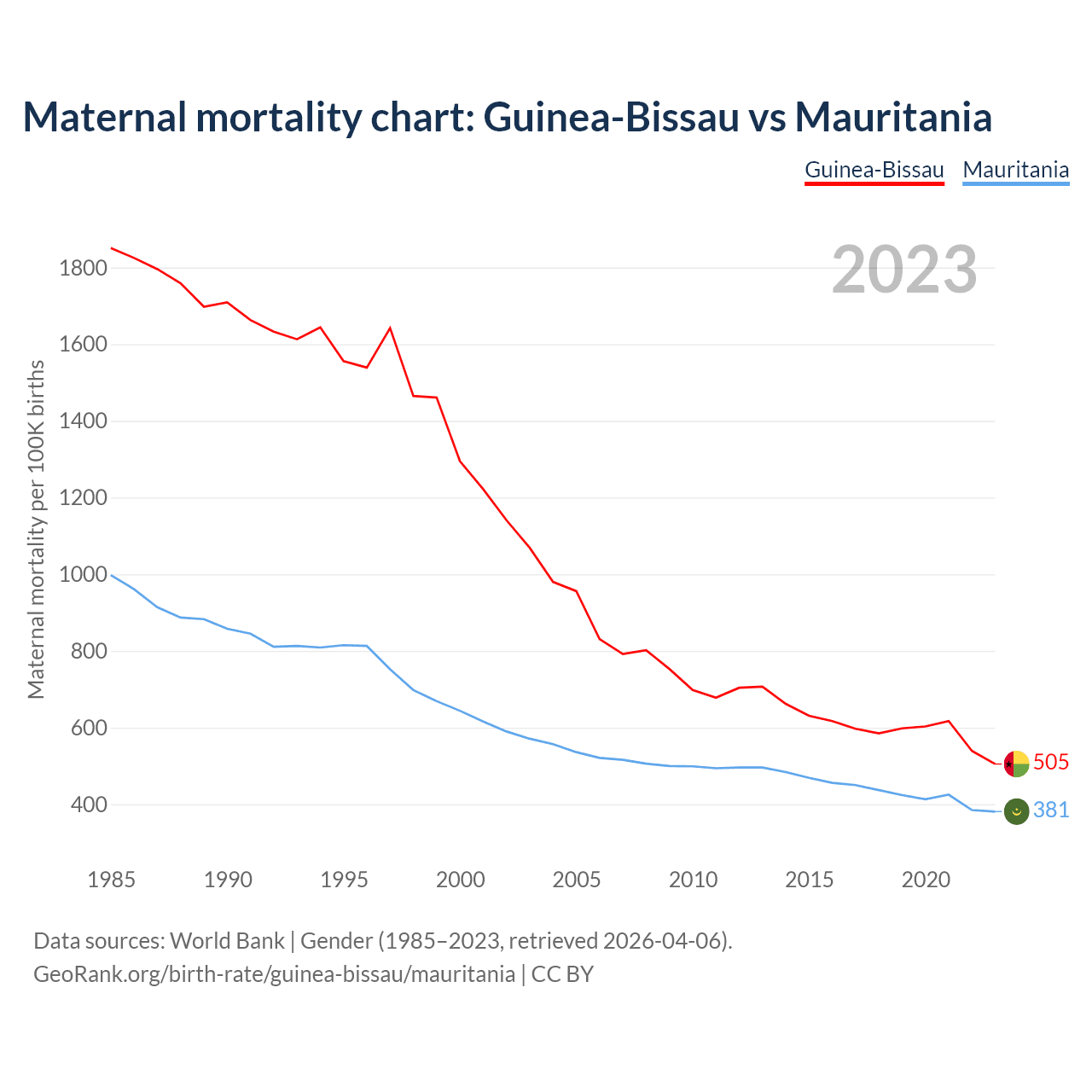 The maternal mortality rate, which is the probability of dying during childbirth or within 42 days of pregnancy termination, is 505 deaths per 100,000 live births in Guinea-Bissau, compared to 381 deaths in Mauritania.