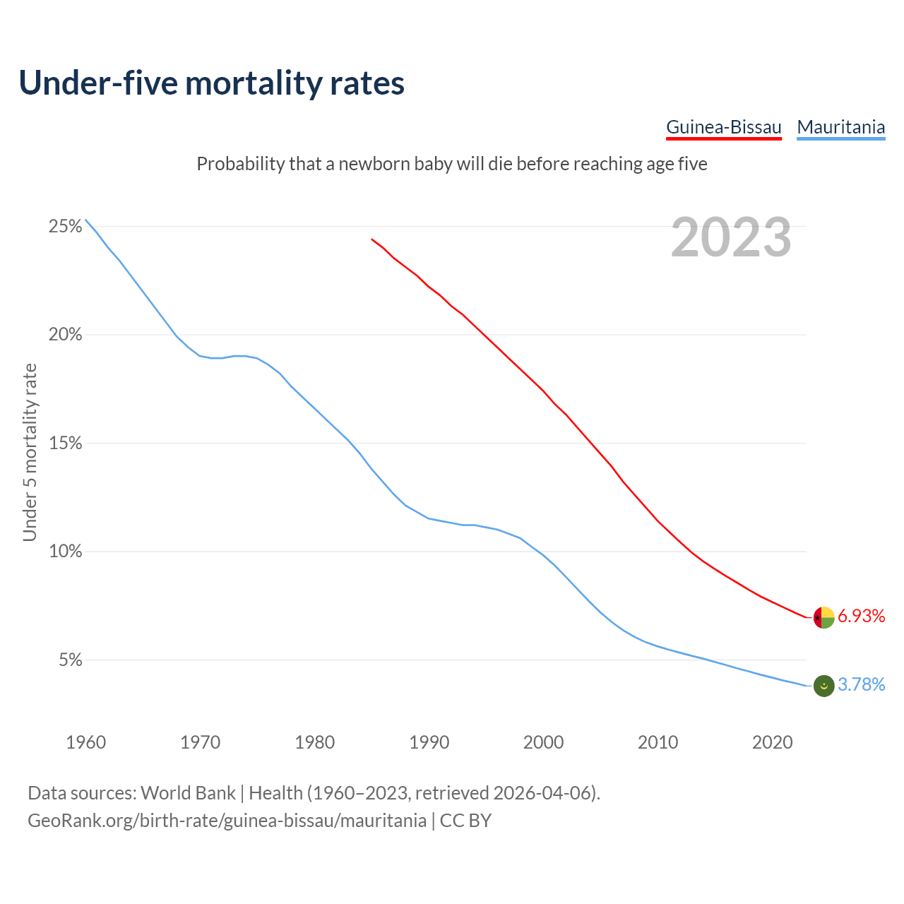 The chance that a newborn baby will die before reaching age five is 6.93% in Guinea-Bissau and 3.78% in Mauritania. Above is a chart with historical data on under-five mortality rates.