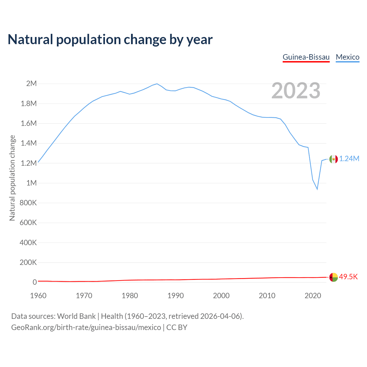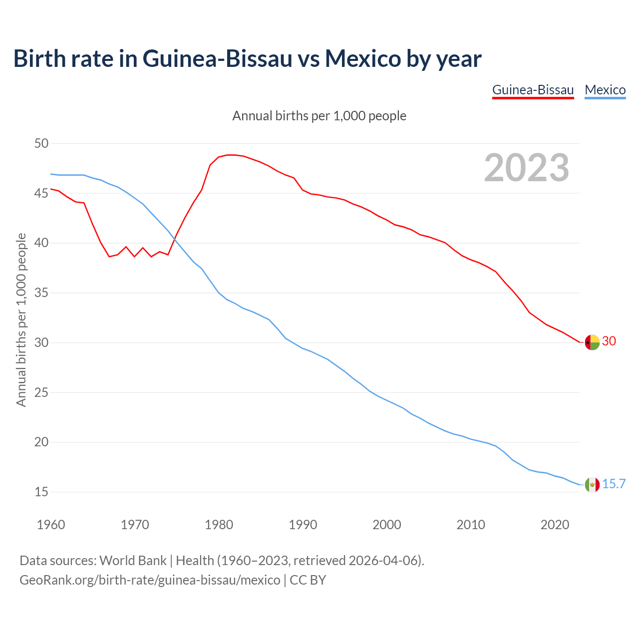 Guinea-Bissau has an annual birth rate of 30 births per 1,000 people, compared to 15.7 for Mexico. The average number of children a woman is expected to have during her lifetime — the fertility rate, is 3.84 in Guinea-Bissau and 1.91 in Mexico — 50.2% difference.