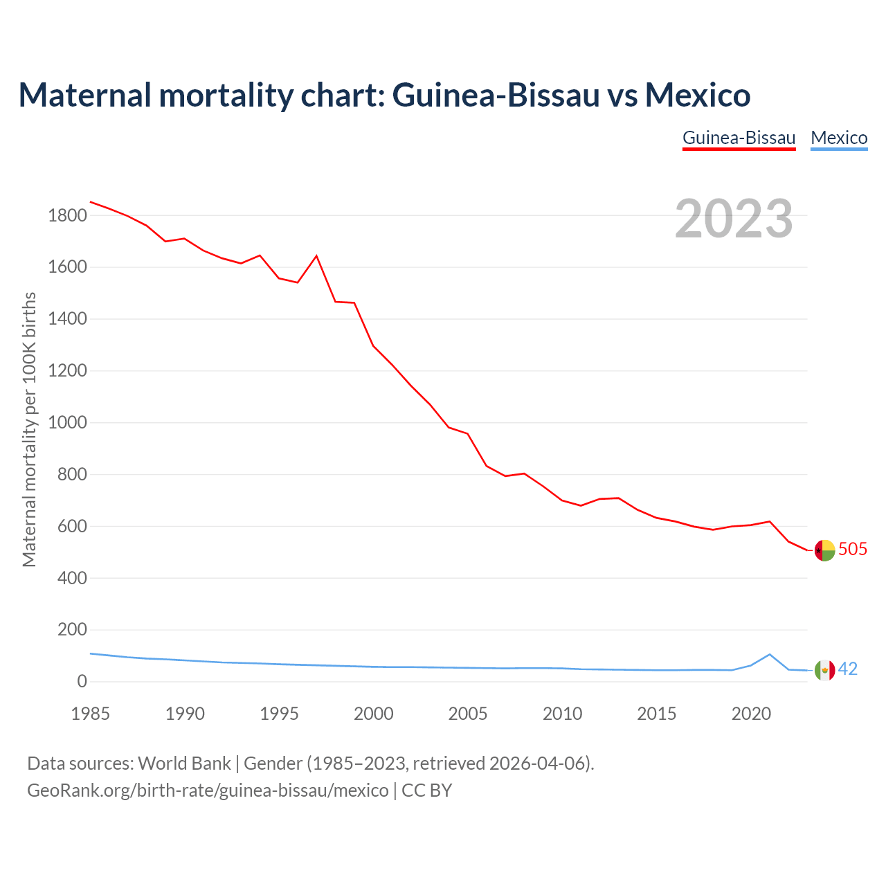 The maternal mortality rate, which is the probability of dying during childbirth or within 42 days of pregnancy termination, is 505 deaths per 100,000 live births in Guinea-Bissau, compared to 42 deaths in Mexico.