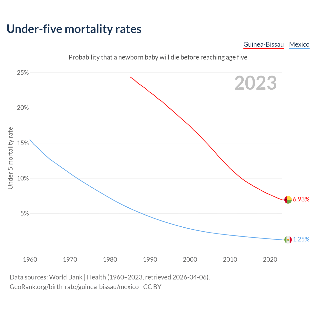 The chance that a newborn baby will die before reaching age five is 6.93% in Guinea-Bissau and 1.25% in Mexico. Above is a chart with historical data on under-five mortality rates.