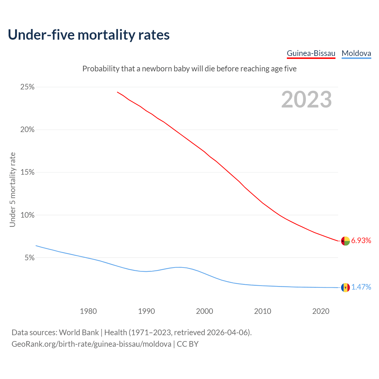 The chance that a newborn baby will die before reaching age five is 6.93% in Guinea-Bissau and 1.47% in Moldova. Above is a chart with historical data on under-five mortality rates.
