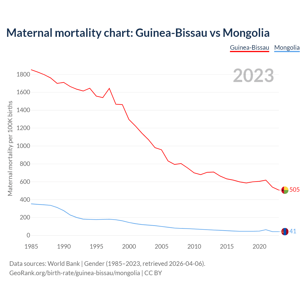 The maternal mortality rate, which is the probability of dying during childbirth or within 42 days of pregnancy termination, is 505 deaths per 100,000 live births in Guinea-Bissau, compared to 41 deaths in Mongolia.