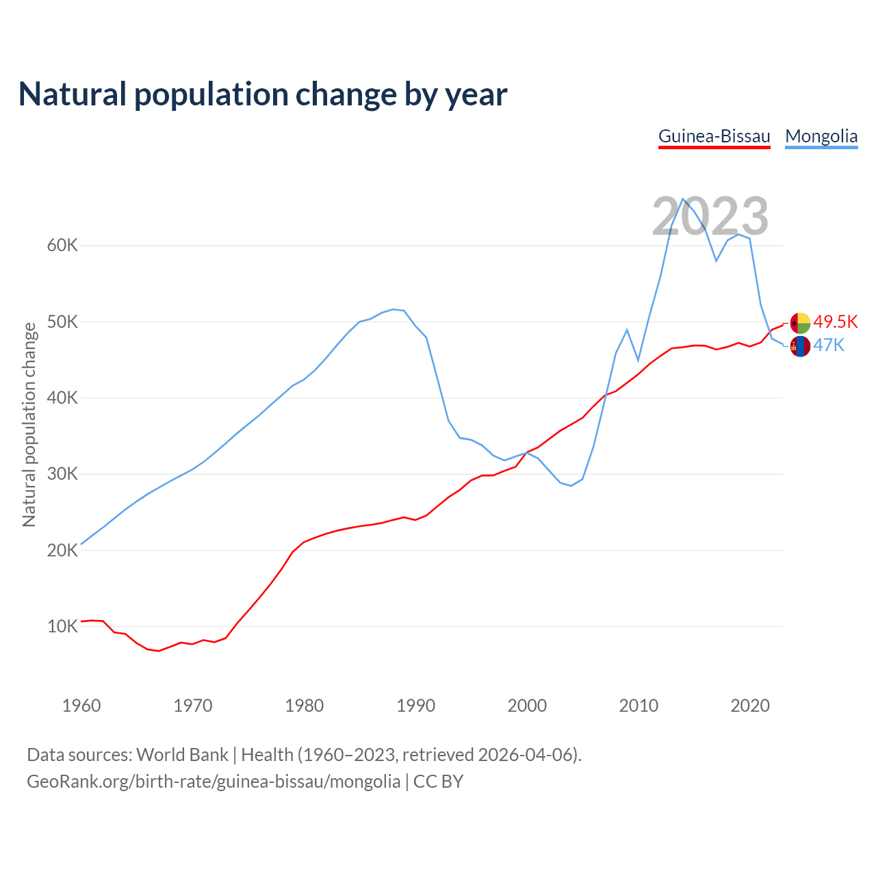 - Guinea-Bissau is ranked 32/196 by birth rate compared to 81/196 for Mongolia.
