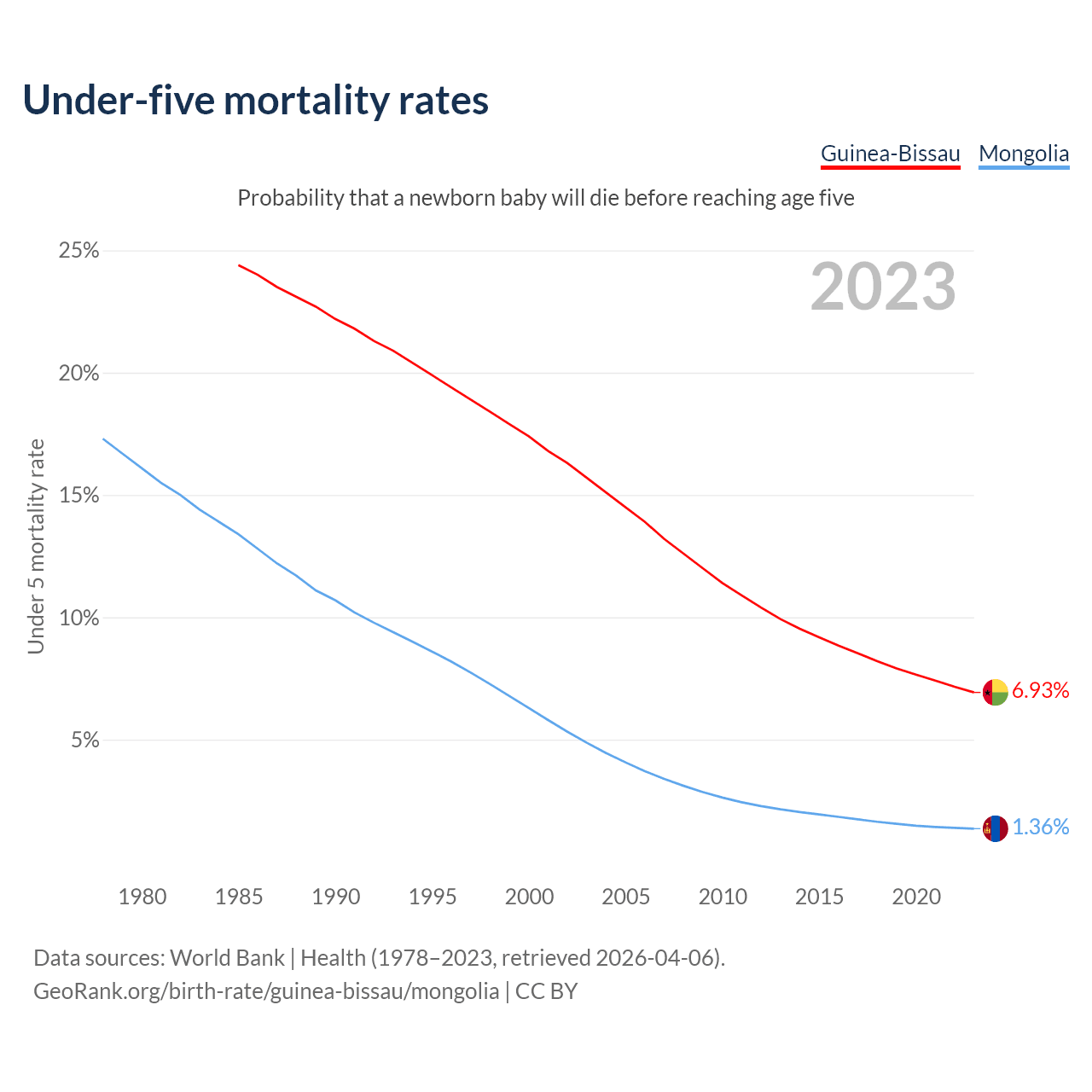 The chance that a newborn baby will die before reaching age five is 6.93% in Guinea-Bissau and 1.36% in Mongolia. Above is a chart with historical data on under-five mortality rates.