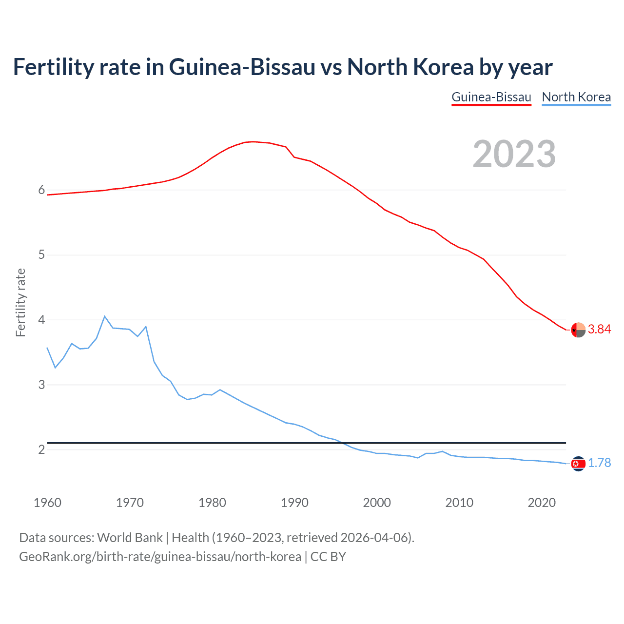 According to the latest available data on birth rates, the fertility rate in Guinea-Bissau was 3.84 children per woman in 2023, compared to 1.78 in North Korea in 2023. The replacement level is considered to be 2.1 children per woman.