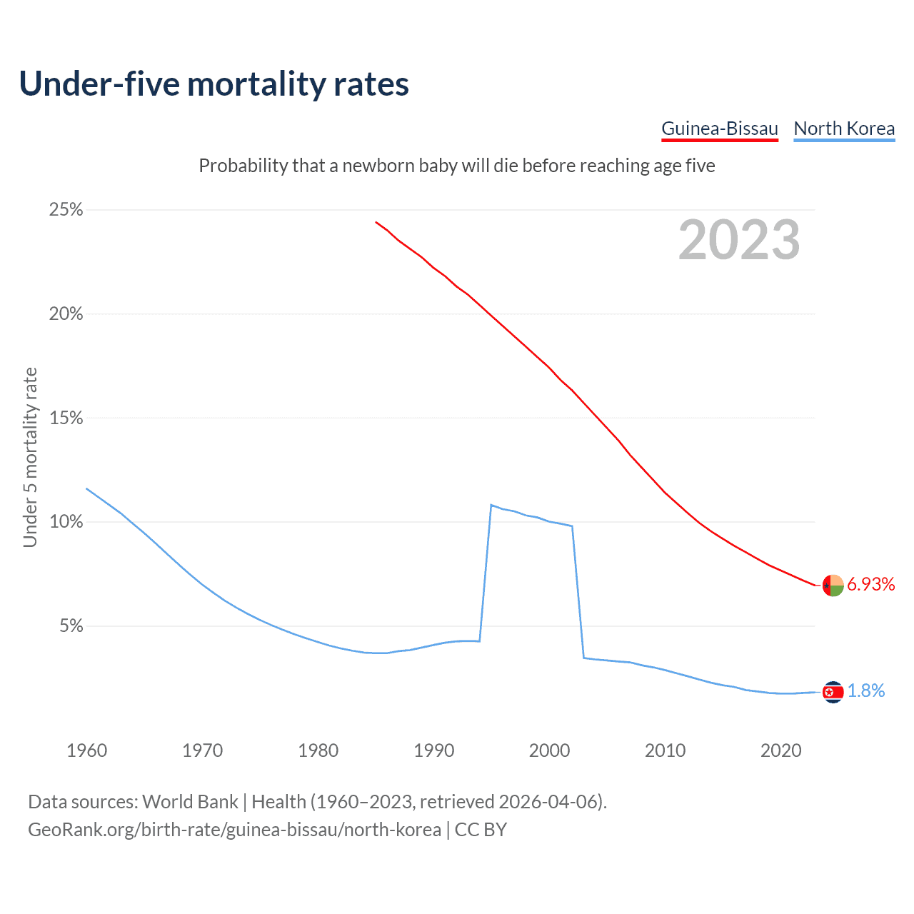 The chance that a newborn baby will die before reaching age five is 6.93% in Guinea-Bissau and 1.8% in North Korea. Above is a chart with historical data on under-five mortality rates.