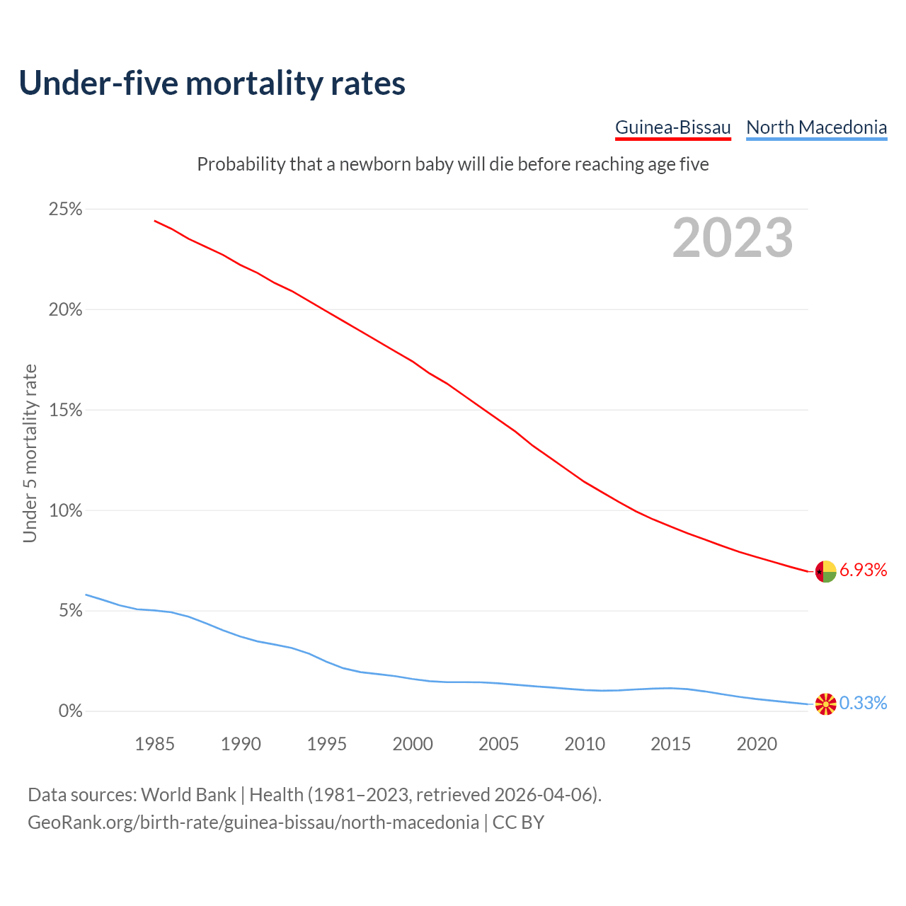 The chance that a newborn baby will die before reaching age five is 6.93% in Guinea-Bissau and 0.33% in North Macedonia. Above is a chart with historical data on under-five mortality rates.