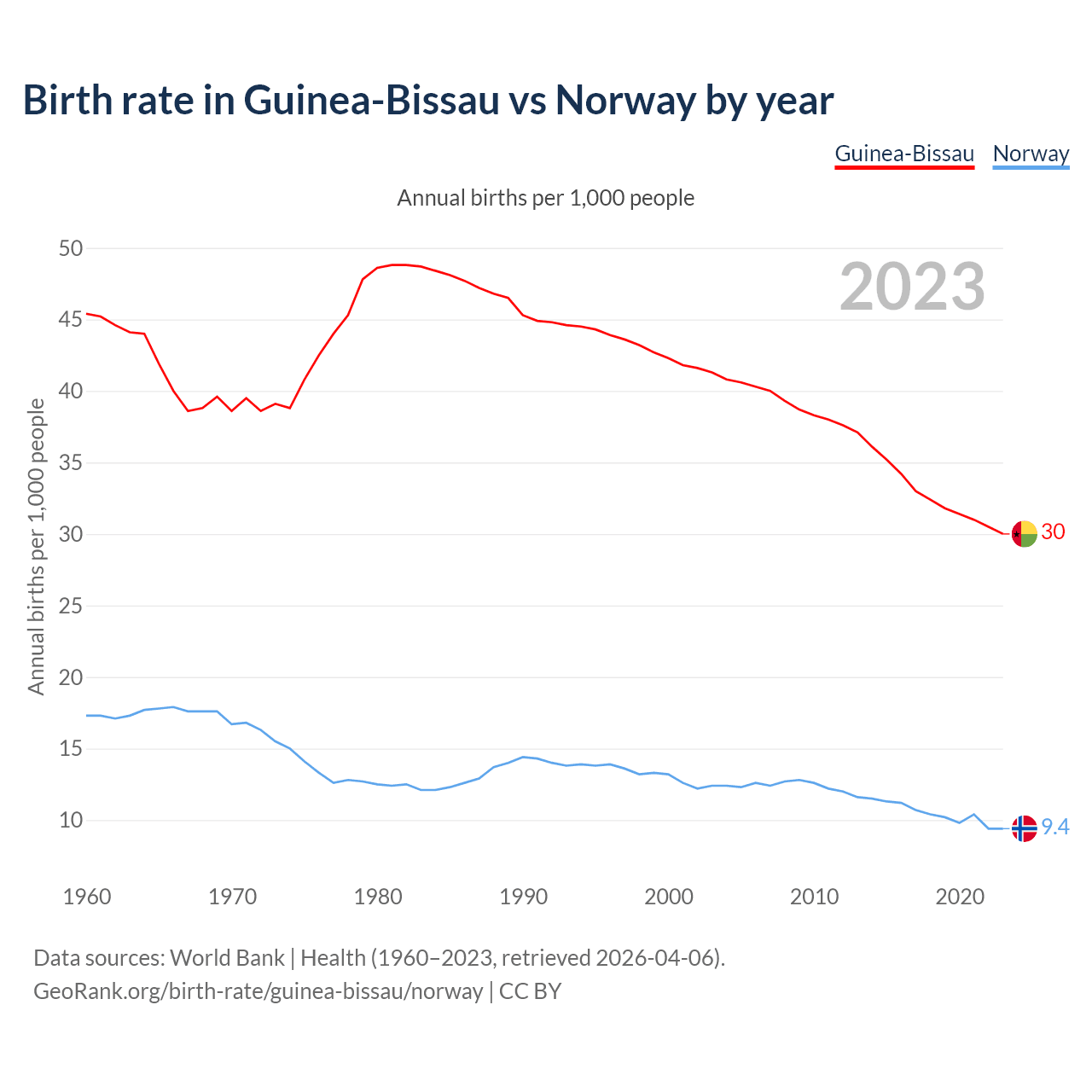 Guinea-Bissau has an annual birth rate of 30 births per 1,000 people, compared to 9.4 for Norway. The average number of children a woman is expected to have during her lifetime — the fertility rate, is 3.84 in Guinea-Bissau and 1.4 in Norway — 63.5% difference.