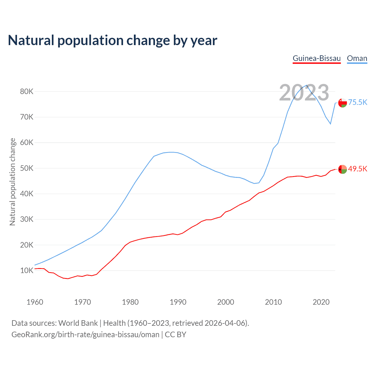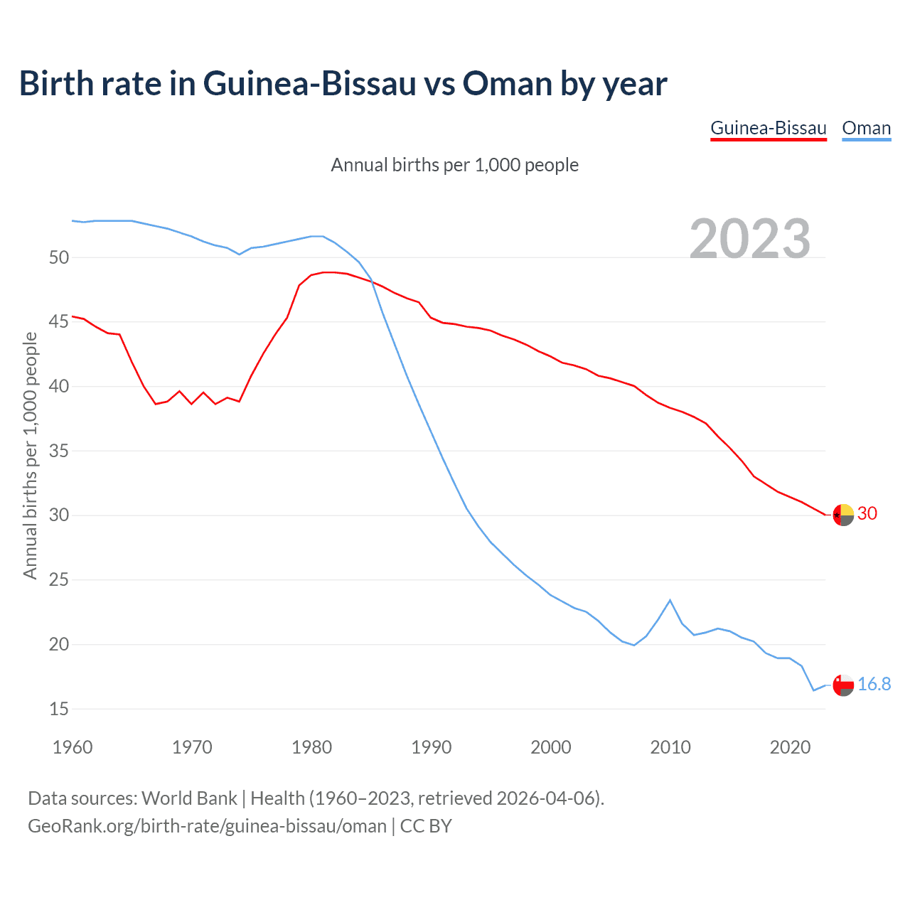 Guinea-Bissau has an annual birth rate of 30 births per 1,000 people, compared to 16.8 for Oman. The average number of children a woman is expected to have during her lifetime — the fertility rate, is 3.84 in Guinea-Bissau and 2.53 in Oman — 34.2% difference.