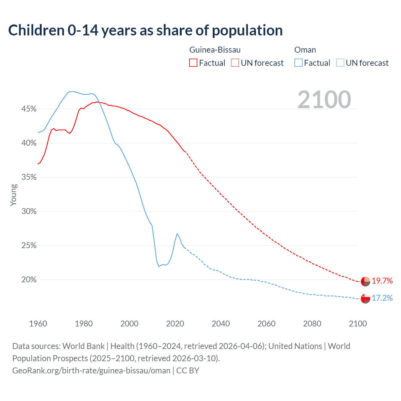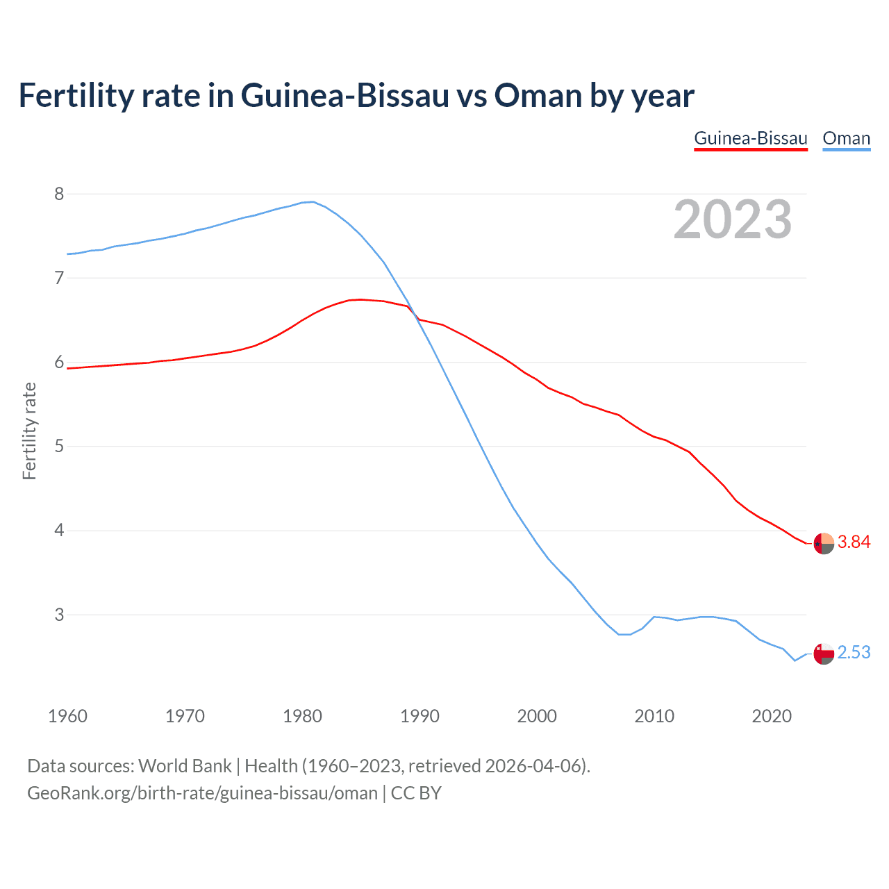 According to the latest available data on birth rates, the fertility rate in Guinea-Bissau was 3.84 children per woman in 2023, compared to 2.53 in Oman in 2023. The replacement level is considered to be 2.1 children per woman.