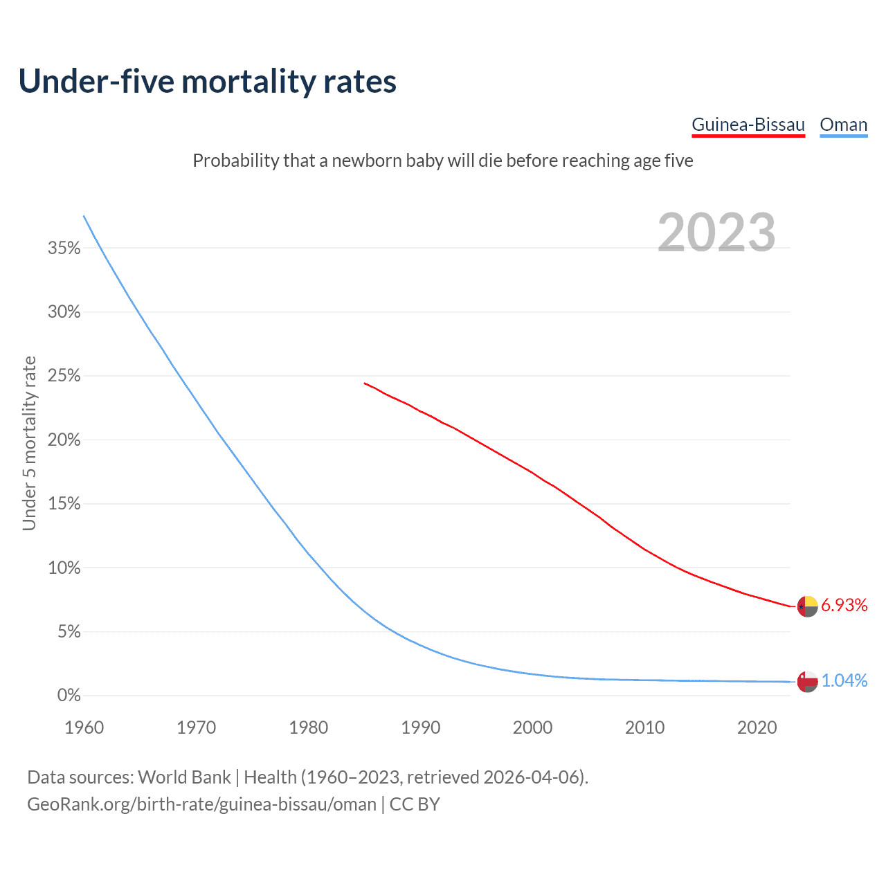 The chance that a newborn baby will die before reaching age five is 6.93% in Guinea-Bissau and 1.04% in Oman. Above is a chart with historical data on under-five mortality rates.