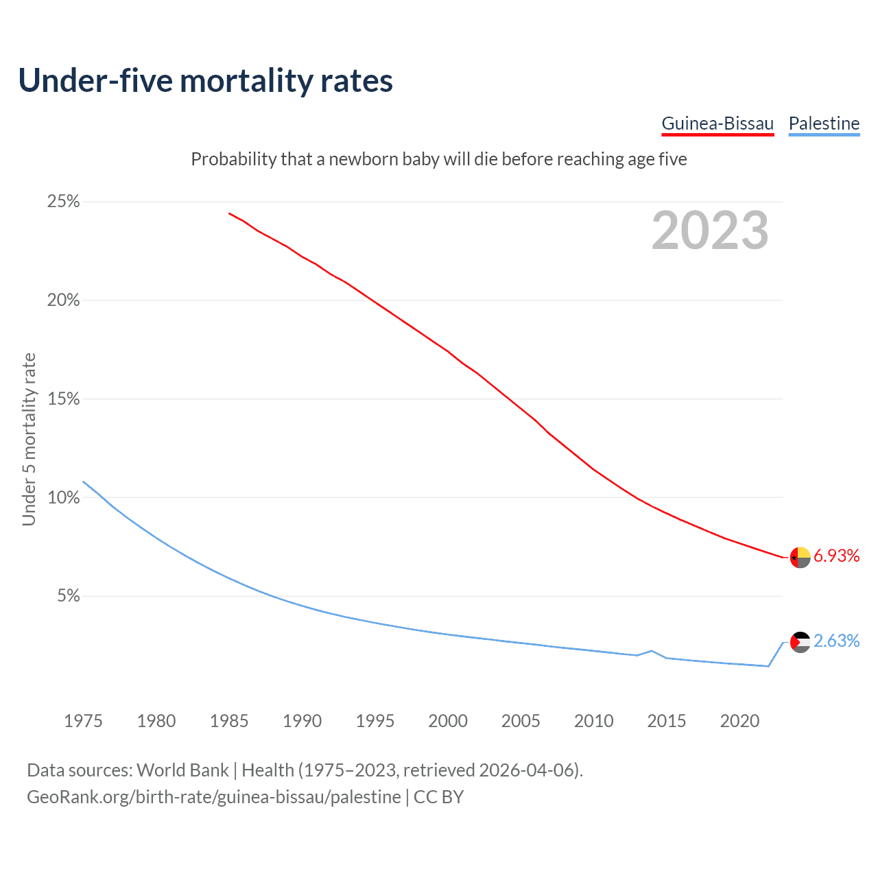 The chance that a newborn baby will die before reaching age five is 6.93% in Guinea-Bissau and 2.63% in Palestine. Above is a chart with historical data on under-five mortality rates.