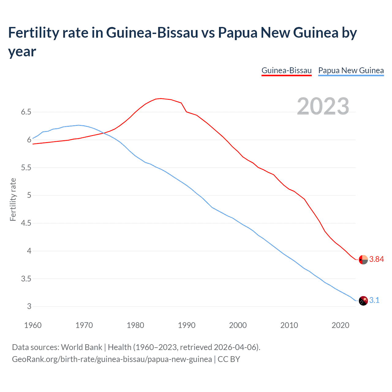 1960 vs 2023, the fertility rate has decreased by 35.2% in Guinea-Bissau and by 48.5% in Papua New Guinea — in 1960, it was 5.92 and 6.02, respectively.