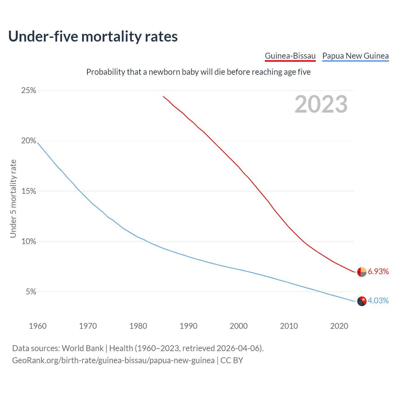The chance that a newborn baby will die before reaching age five is 6.93% in Guinea-Bissau and 4.03% in Papua New Guinea. Above is a chart with historical data on under-five mortality rates.