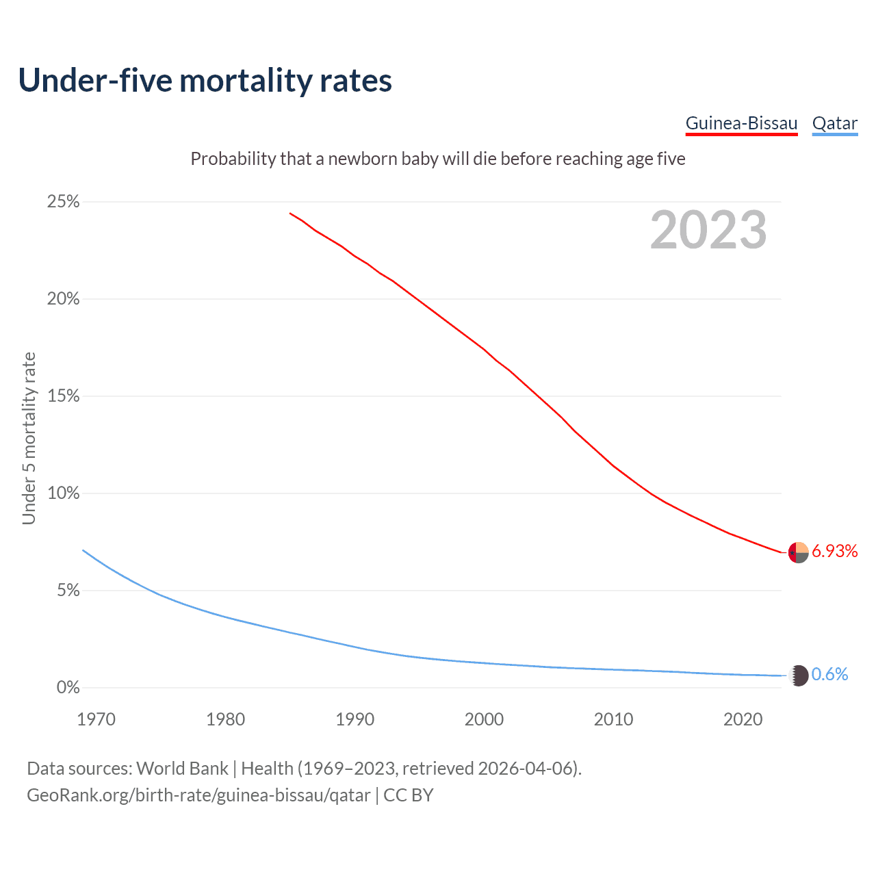 The chance that a newborn baby will die before reaching age five is 6.93% in Guinea-Bissau and 0.6% in Qatar. Above is a chart with historical data on under-five mortality rates.