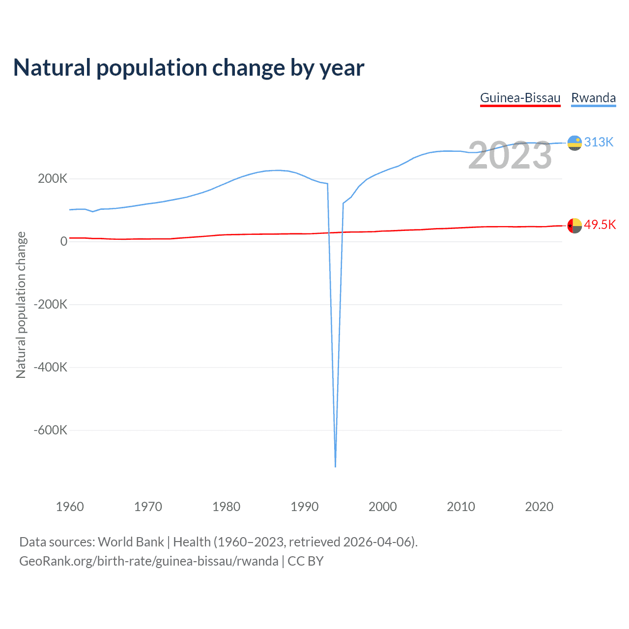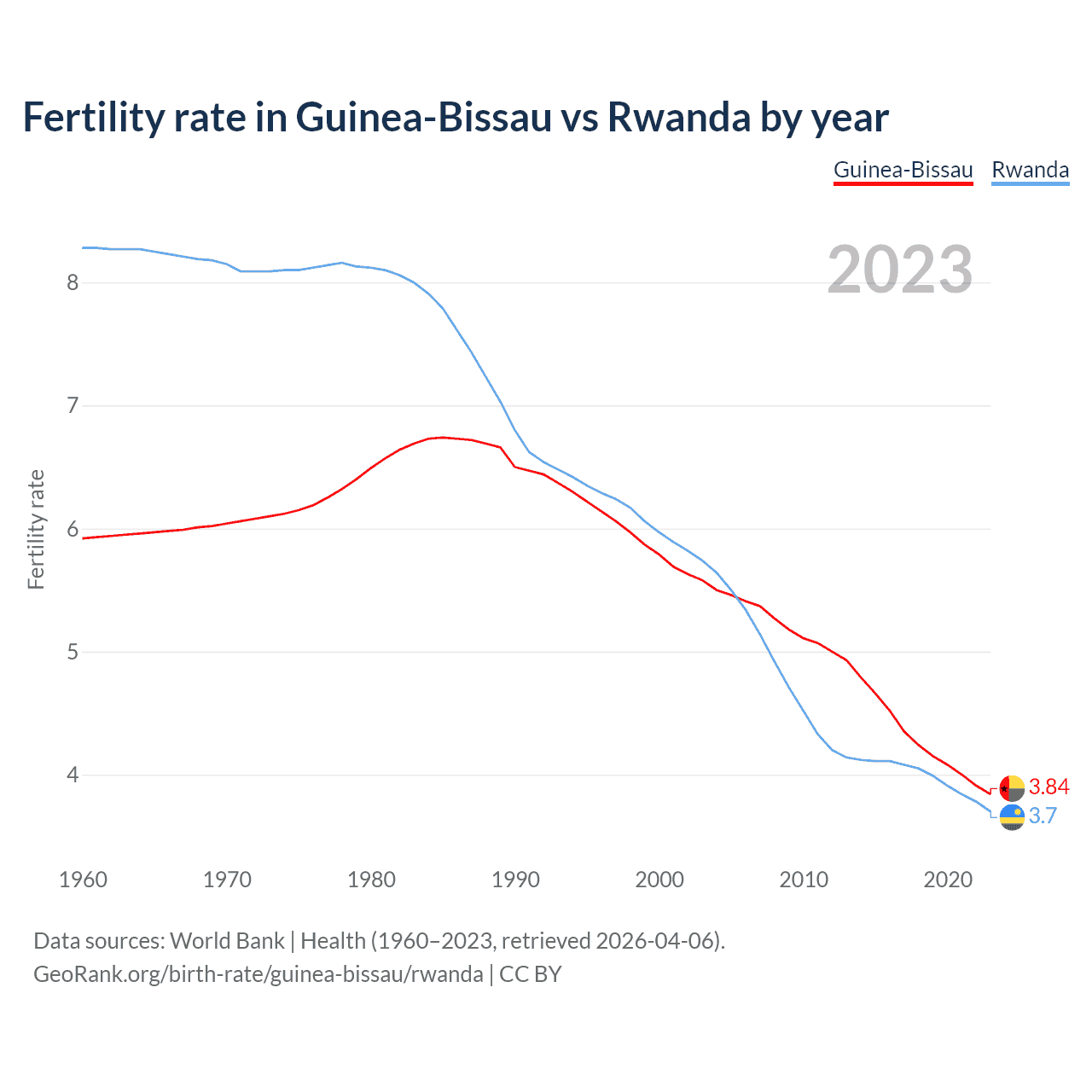 1960 vs 2023, the fertility rate has decreased by 35.2% in Guinea-Bissau and by 55.4% in Rwanda — in 1960, it was 5.92 and 8.28, respectively.