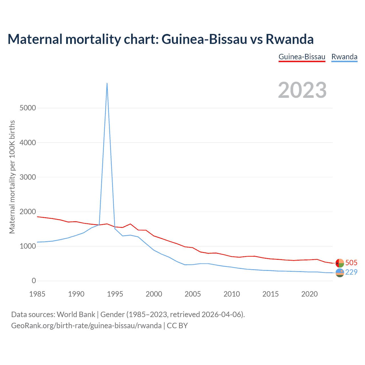 The maternal mortality rate, which is the probability of dying during childbirth or within 42 days of pregnancy termination, is 505 deaths per 100,000 live births in Guinea-Bissau, compared to 229 deaths in Rwanda.