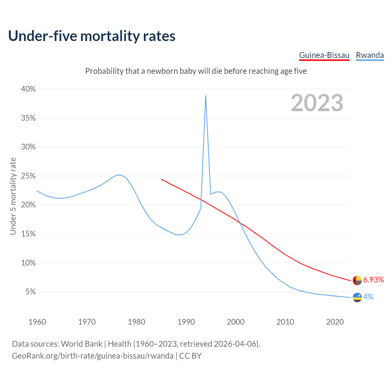 The chance that a newborn baby will die before reaching age five is 6.93% in Guinea-Bissau and 4% in Rwanda. Above is a chart with historical data on under-five mortality rates.