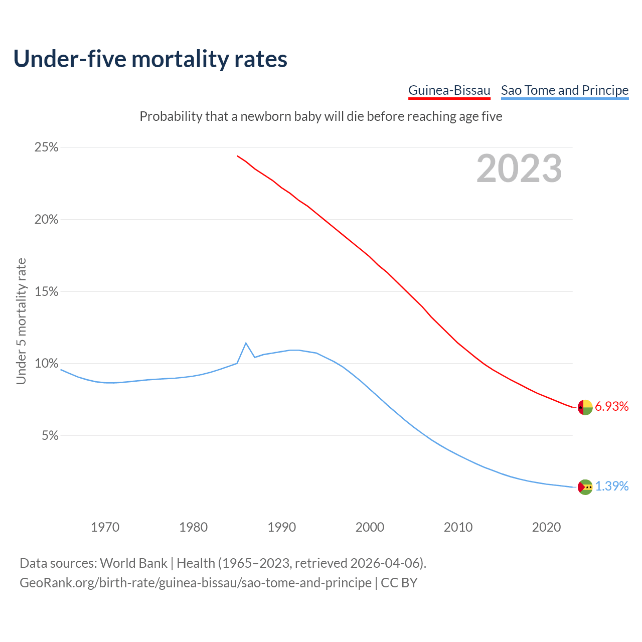 The chance that a newborn baby will die before reaching age five is 6.93% in Guinea-Bissau and 1.39% in Sao Tome and Principe. Above is a chart with historical data on under-five mortality rates.