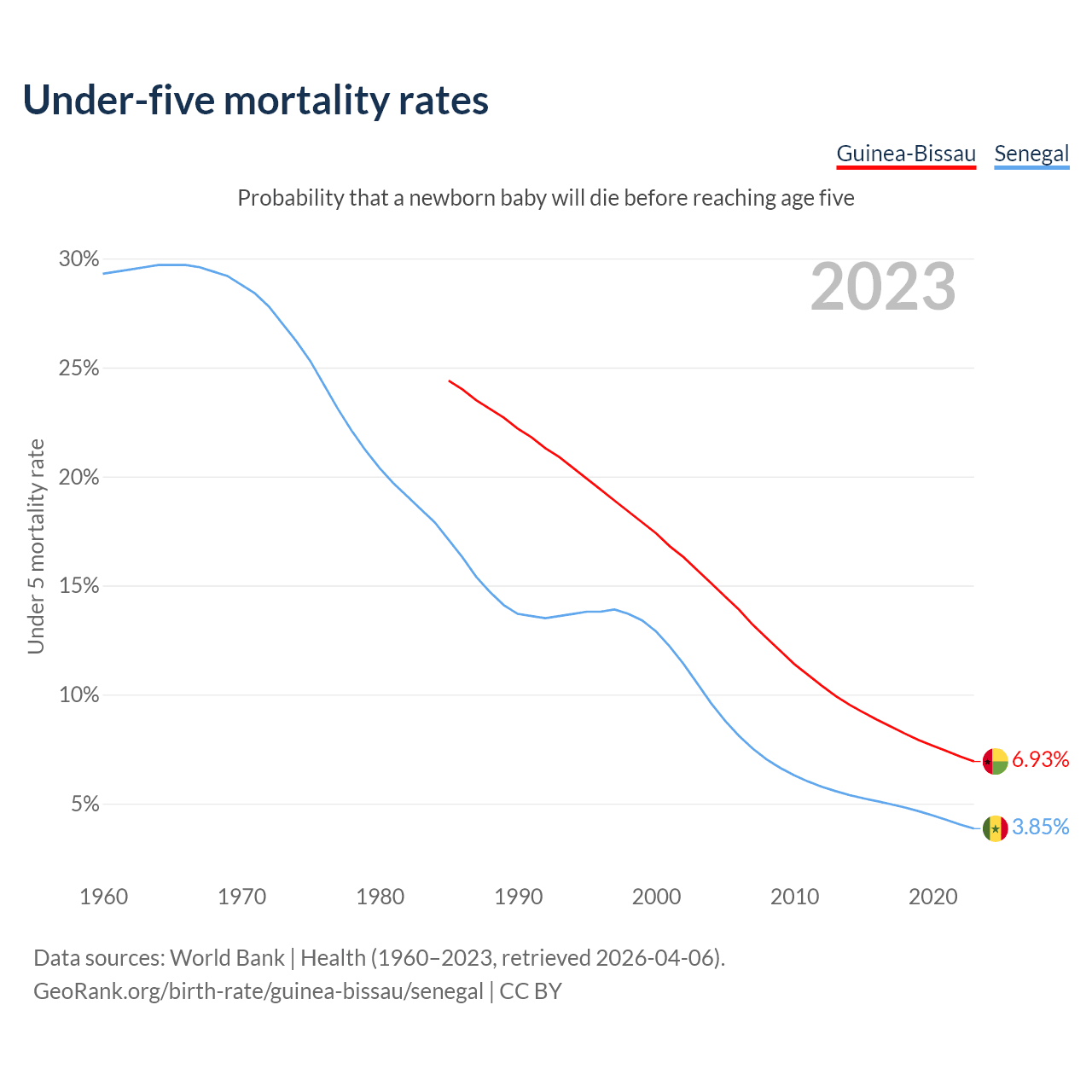 The chance that a newborn baby will die before reaching age five is 6.93% in Guinea-Bissau and 3.85% in Senegal. Above is a chart with historical data on under-five mortality rates.