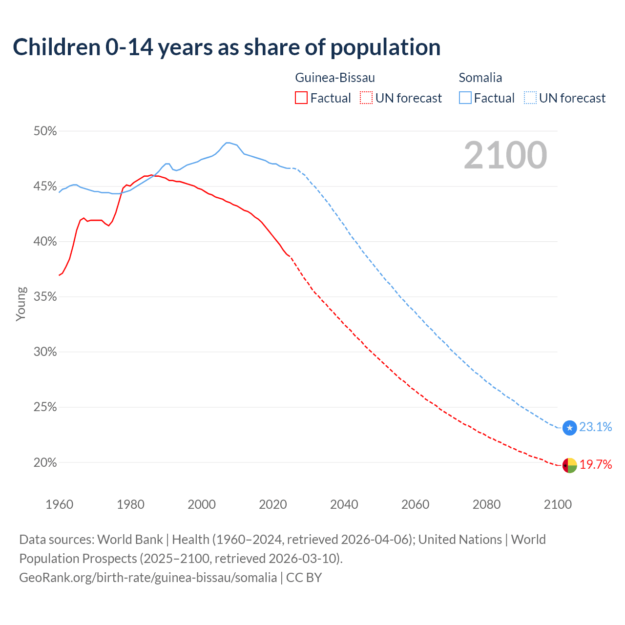 Data sources: World Bank | Health (1960–2024, retrieved 2026-04-06); United Nations | World Population Prospects (2025–2100, retrieved 2026-03-10).