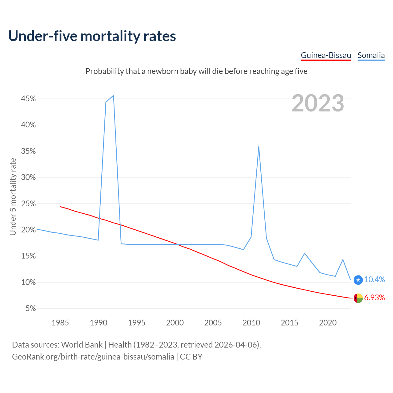 The chance that a newborn baby will die before reaching age five is 6.93% in Guinea-Bissau and 10.4% in Somalia. Above is a chart with historical data on under-five mortality rates.