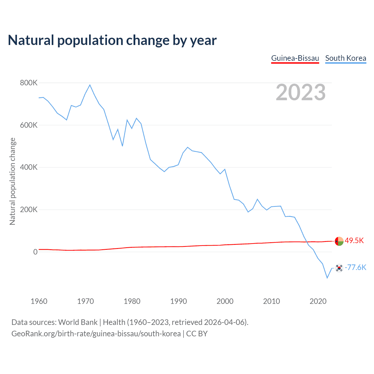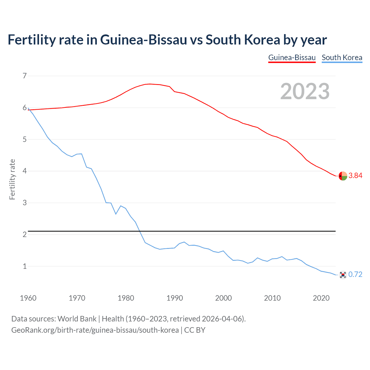 According to the latest available data on birth rates, the fertility rate in Guinea-Bissau was 3.84 children per woman in 2023, compared to 0.72 in South Korea in 2023. The replacement level is considered to be 2.1 children per woman.