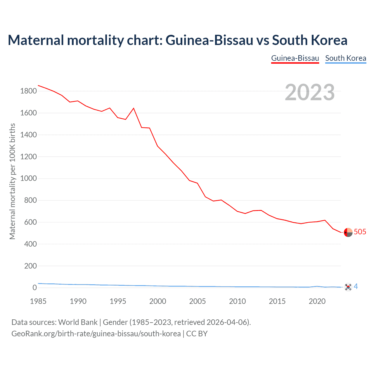 The maternal mortality rate, which is the probability of dying during childbirth or within 42 days of pregnancy termination, is 505 deaths per 100,000 live births in Guinea-Bissau, compared to 4 deaths in South Korea.
