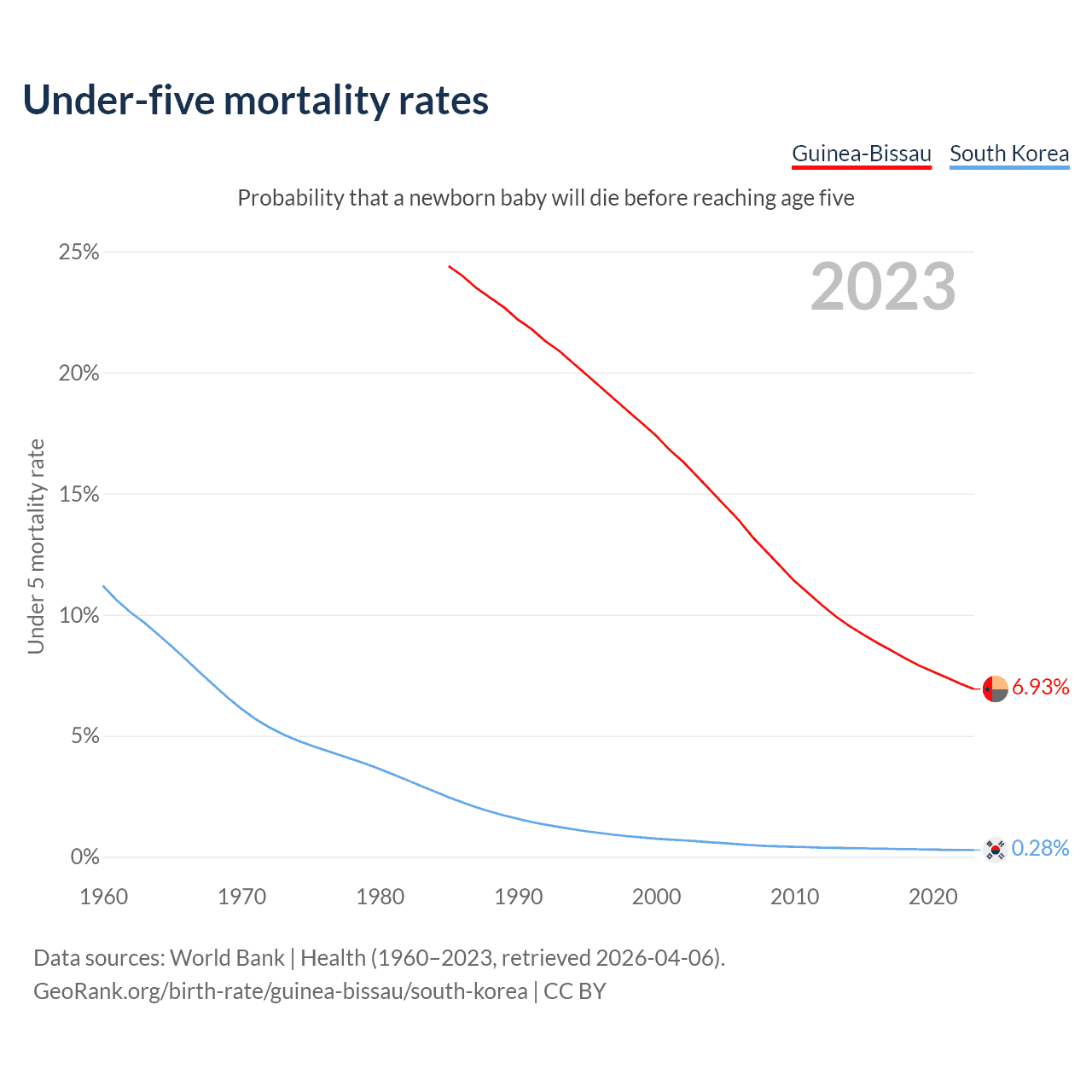 The chance that a newborn baby will die before reaching age five is 6.93% in Guinea-Bissau and 0.28% in South Korea. Above is a chart with historical data on under-five mortality rates.