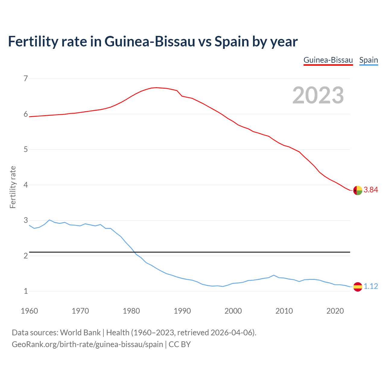 1960 vs 2023, the fertility rate has decreased by 35.2% in Guinea-Bissau and by 60.8% in Spain — in 1960, it was 5.92 and 2.86, respectively.