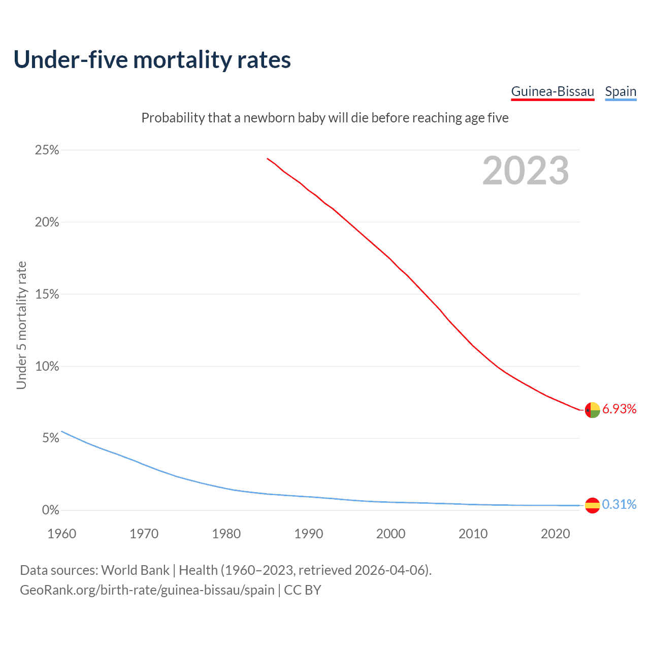 The chance that a newborn baby will die before reaching age five is 6.93% in Guinea-Bissau and 0.31% in Spain. Above is a chart with historical data on under-five mortality rates.