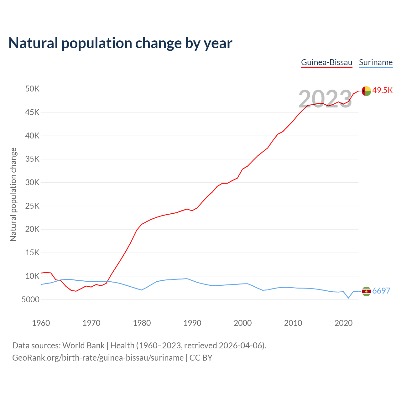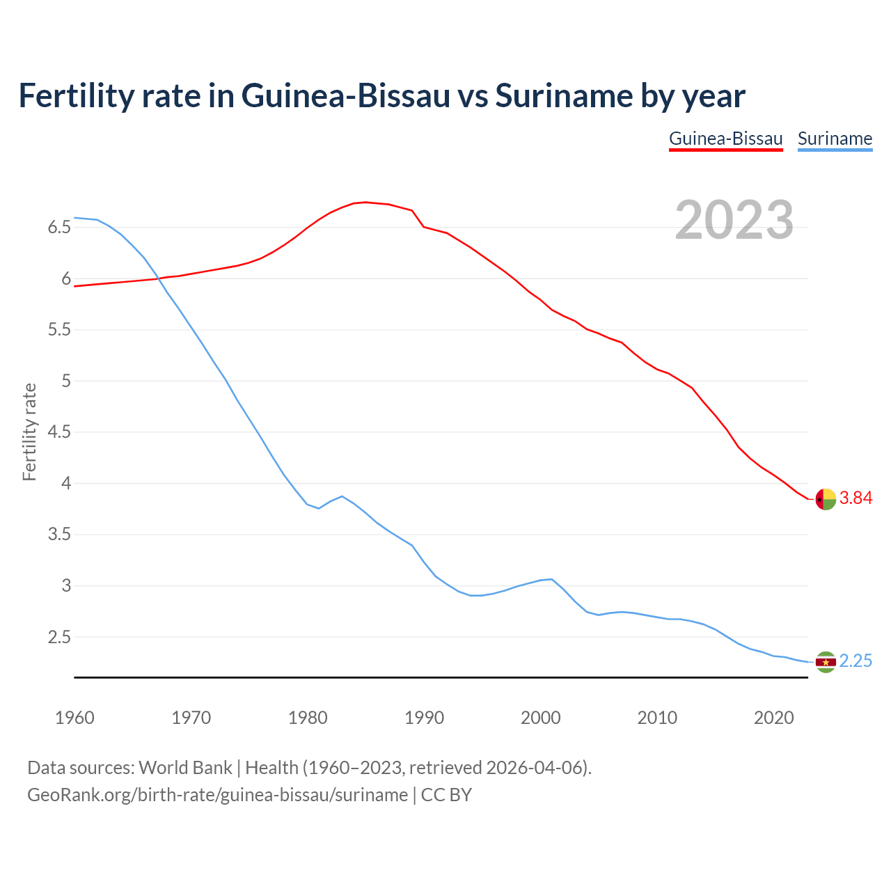 According to the latest available data on birth rates, the fertility rate in Guinea-Bissau was 3.84 children per woman in 2023, compared to 2.25 in Suriname in 2023. The replacement level is considered to be 2.1 children per woman.