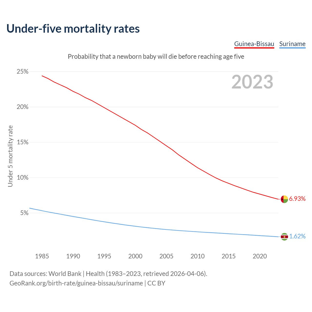 The chance that a newborn baby will die before reaching age five is 6.93% in Guinea-Bissau and 1.62% in Suriname. Above is a chart with historical data on under-five mortality rates.