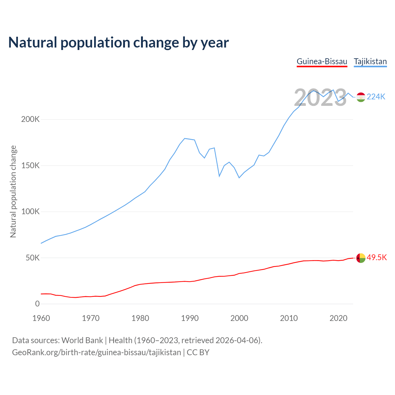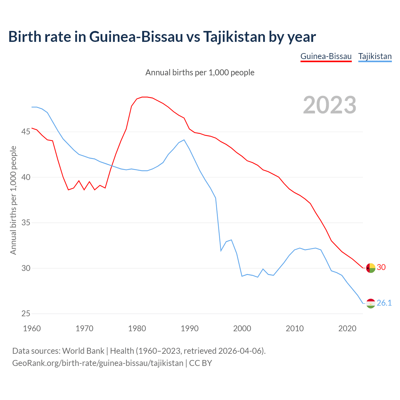 Guinea-Bissau has an annual birth rate of 30 births per 1,000 people, compared to 26.1 for Tajikistan. The average number of children a woman is expected to have during her lifetime — the fertility rate, is 3.84 in Guinea-Bissau and 3.07 in Tajikistan — 19.9% difference.