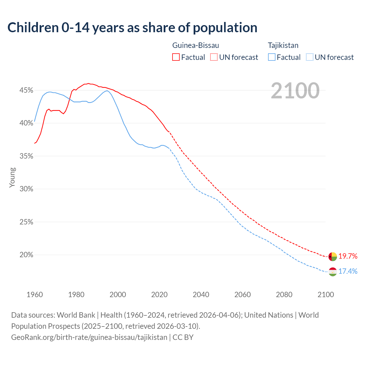 According to the latest available data on birth rates, the fertility rate in Guinea-Bissau was 3.84 children per woman in 2023, compared to 3.07 in Tajikistan in 2023. The replacement level is considered to be 2.1 children per woman.