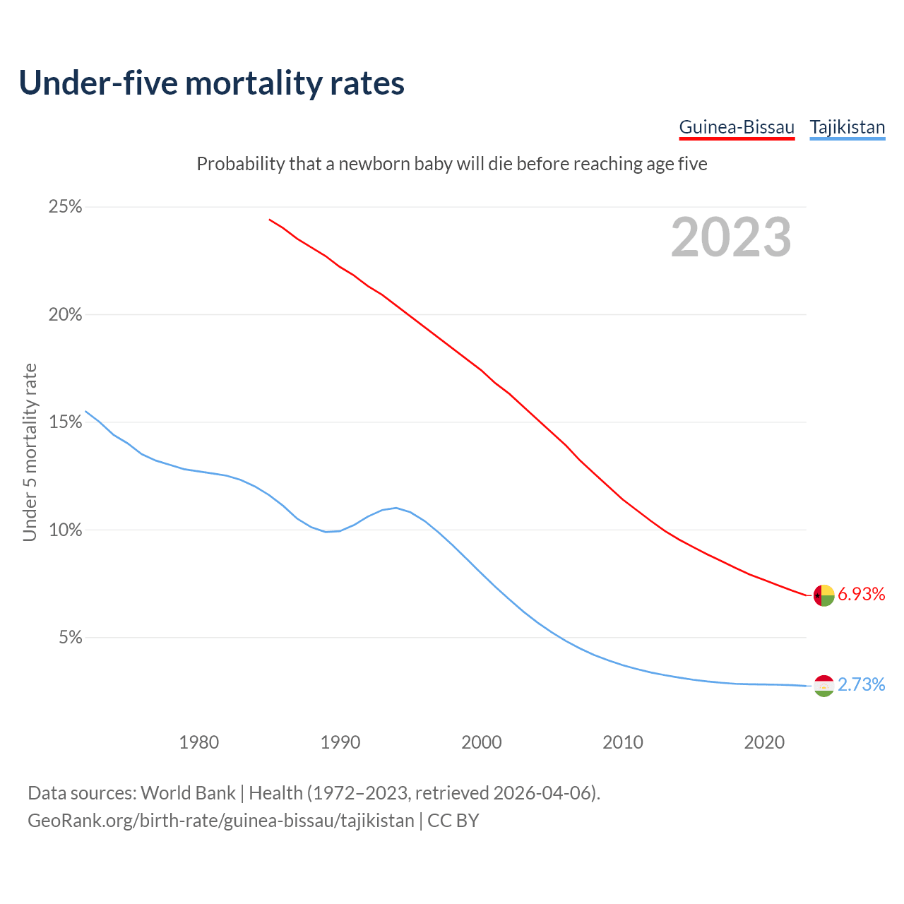 The chance that a newborn baby will die before reaching age five is 6.93% in Guinea-Bissau and 2.73% in Tajikistan. Above is a chart with historical data on under-five mortality rates.